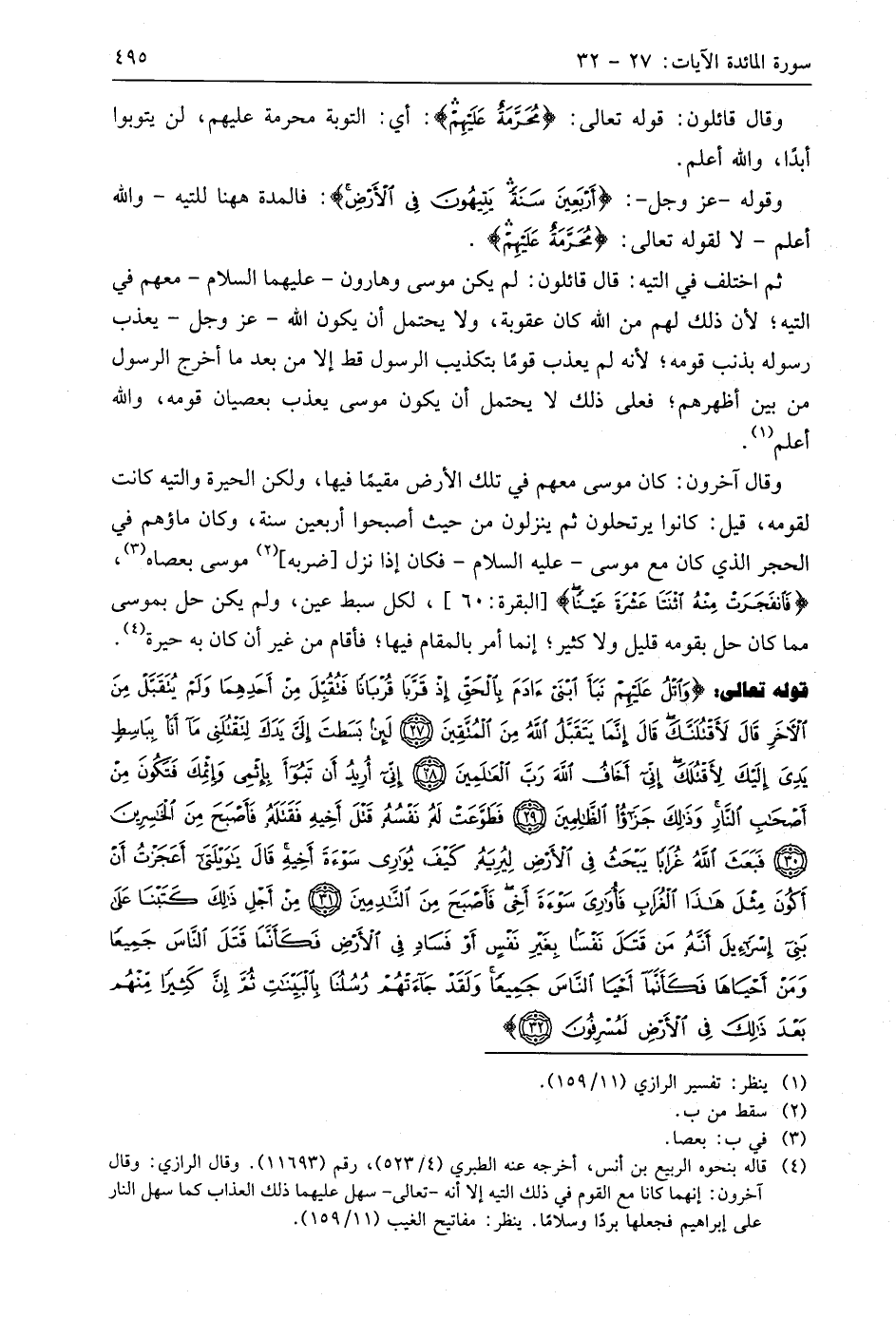 وقوله - عَزَّ وَجَلَّ -: (أَرْبَعِينَ سَنَةً يَتِيهُونَ فِي الْأَرْضِ): فالمدة هاهنا للتيه - واللَّه أعلم - لا لقوله تعالى: (مُحَرَّمَةٌ عَلَيْهِمْ).