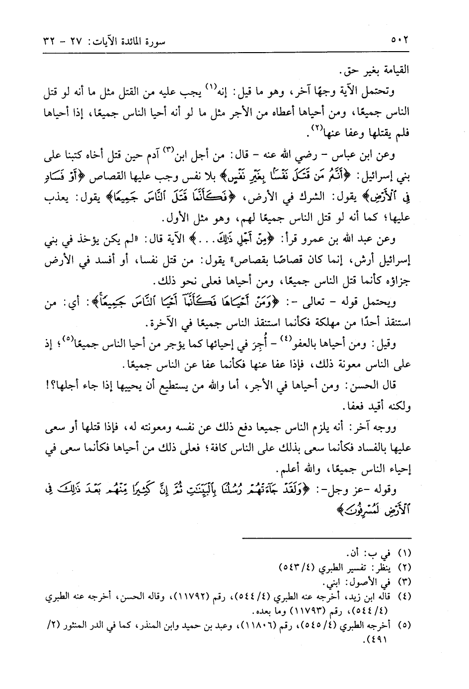 وعن ابن عَبَّاسٍ - رَضِيَ اللَّهُ عَنْهُ - قال: من أجل ابن آدم حين قتل أخاه كتبنا على بني إسرائيل: (أَنَّهُ مَنْ قَتَلَ نَفْسًا بِغَيْرِ نَفْسٍ) بلا نفس وجب عليها القصاص (أَوْ فَسَادٍ فِي الْأَرْضِ) يقول: الشرك في الأرض، (فَكَأَنَّمَا قَتَلَ النَّاسَ جَمِيعًا) يقول: يعذب عليها؛ كما أنه لو قتل الناس جميعًا لهم، وهو مثل الأول.