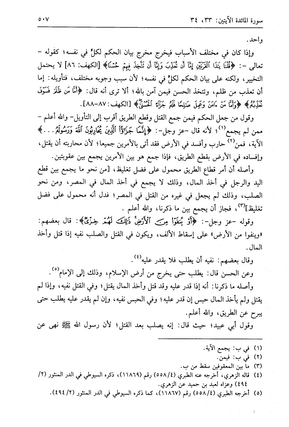 وقول من جعل الحكم فيمن جمع القتل وقطع الطريق أقرب إلى التأويل - واللَّه أعلم - ممن لم يجمع؛ لأنه قال - عَزَّ وَجَلَّ -: (إِنَّمَا جَزَاءُ الَّذِينَ يُحَارِبُونَ اللَّهَ وَرَسُولَهُ. . .) الآية، فمن حارب وأفسد في الأرض فقد أتى بالأمرين جميعا؛ لأن محاربته أن يقتل، وإفساده في الأرض بقطع الطريق، فإذا جمع هو بين الأمرين يجمع بين عقوبتين.