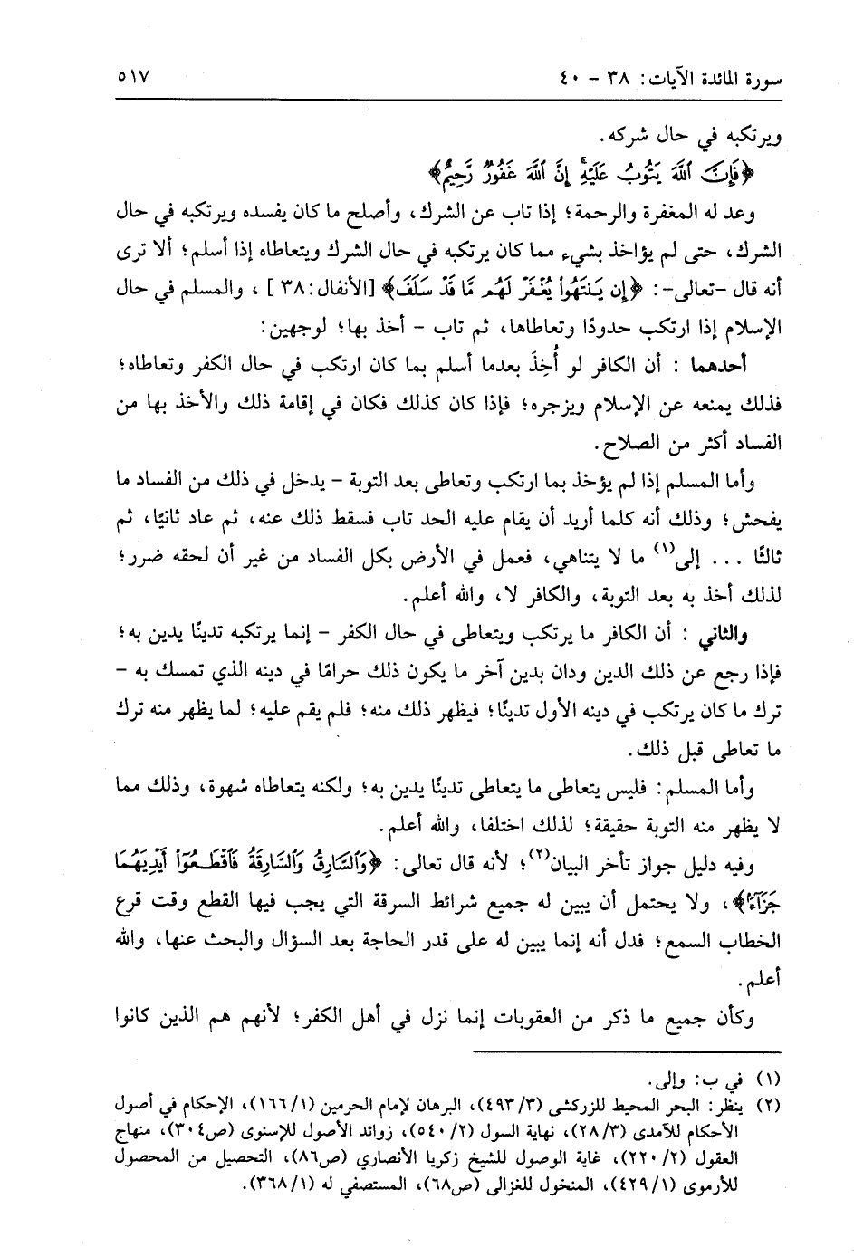وأما المسلم إذا لم يؤخذ بما ارتكب وتعاطى بعد التوبة - يدخل في ذلك من الفساد ما يفحش؛ وذلك أنه كلما أريد أن يقام عليه الحد تاب فسقط ذلك عنه، ثم عاد ثانيًا، ثم ثالثا. . . إلى ما لا يتناهى، فعمل في الأرض بكل الفساد من غير أن لحقه ضرر؛ لذلك أخذ به بعد التوبة، والكافر لا، واللَّه أعلم.