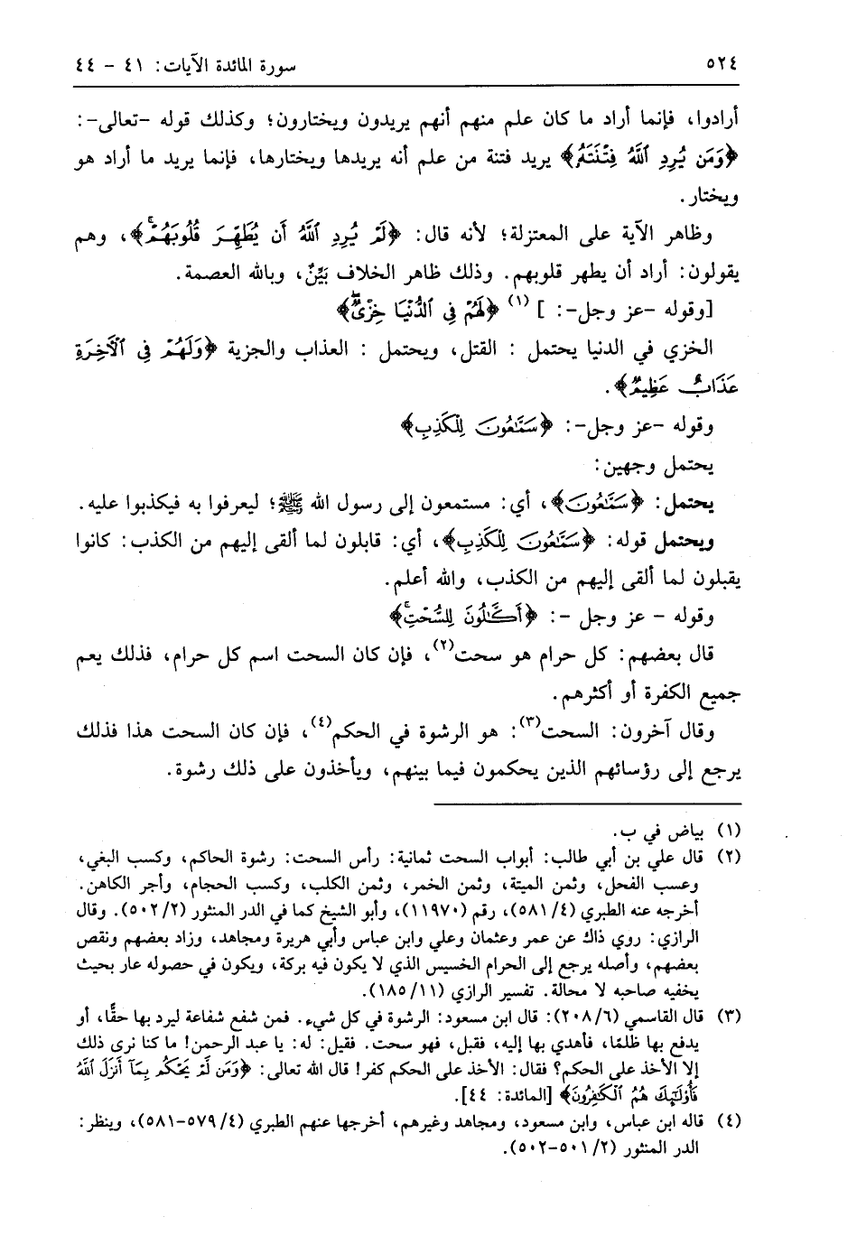 وقال آخرون: السحت: هو الرشوة في الحكم، فإن كان السحت هذا فذلك يرجع إلى رؤسائهم الذين يحكمون فيما بينهم، ويأخذون على ذلك رشوة.