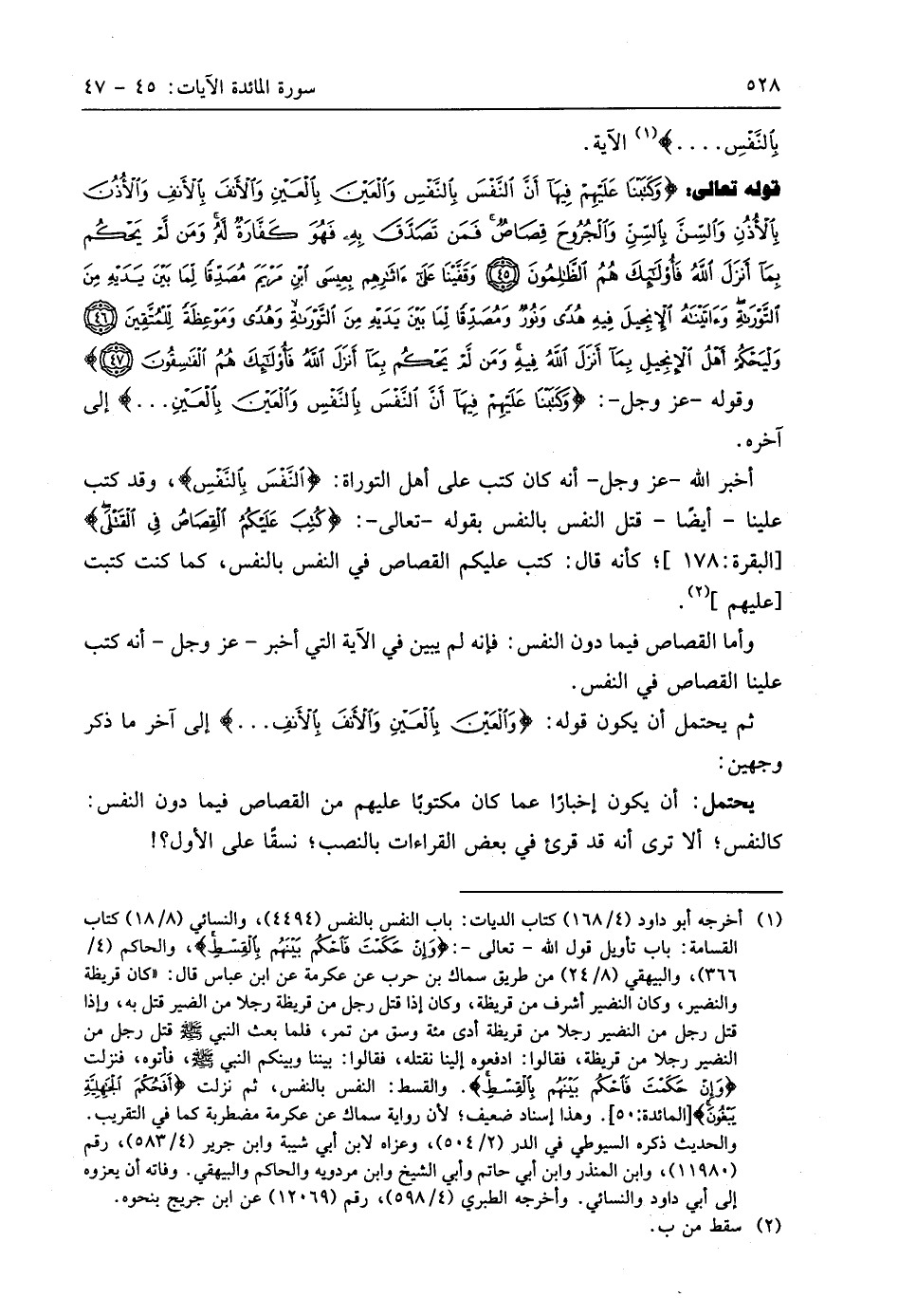 قوله تعالى: (وَكَتَبْنَا عَلَيْهِمْ فِيهَا أَنَّ النَّفْسَ بِالنَّفْسِ وَالْعَيْنَ بِالْعَيْنِ وَالْأَنْفَ بِالْأَنْفِ وَالْأُذُنَ بِالْأُذُنِ وَالسِّنَّ بِالسِّنِّ وَالْجُرُوحَ قِصَاصٌ فَمَنْ تَصَدَّقَ بِهِ فَهُوَ كَفَّارَةٌ لَهُ وَمَنْ لَمْ يَحْكُمْ بِمَا أَنْزَلَ اللَّهُ فَأُولَئِكَ هُمُ الظَّالِمُونَ (45) وَقَفَّيْنَا عَلَى آثَارِهِمْ بِعِيسَى ابْنِ مَرْيَمَ مُصَدِّقًا لِمَا بَيْنَ يَدَيْهِ مِنَ التَّوْرَاةِ وَآتَيْنَاهُ الْإِنْجِيلَ فِيهِ هُدًى وَنُورٌ وَمُصَدِّقًا لِمَا بَيْنَ يَدَيْهِ مِنَ التَّوْرَاةِ وَهُدًى وَمَوْعِظَةً لِلْمُتَّقِينَ (46) وَلْيَحْكُمْ أَهْلُ الْإِنْجِيلِ بِمَا أَنْزَلَ اللَّهُ فِيهِ وَمَنْ لَمْ يَحْكُمْ بِمَا أَنْزَلَ اللَّهُ فَأُولَئِكَ هُمُ الْفَاسِقُونَ (47)