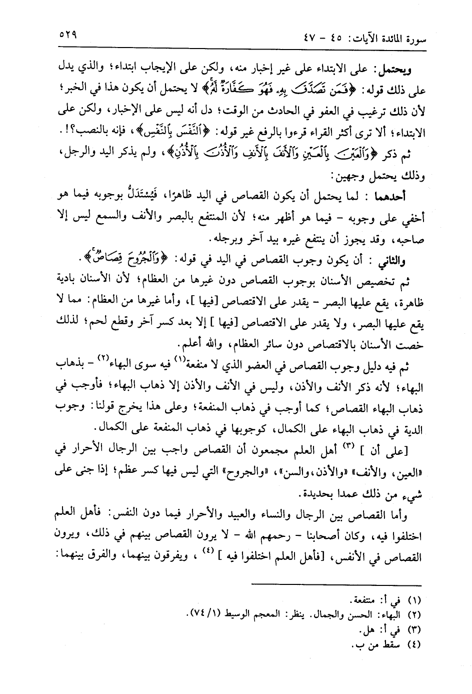 ثم ذكر (وَالْعَيْنَ بِالْعَيْنِ وَالْأَنْفَ بِالْأَنْفِ وَالْأُذُنَ بِالْأُذُنِ)، ولم يذكر اليد والرجل، وذلك يحتمل وجهين: