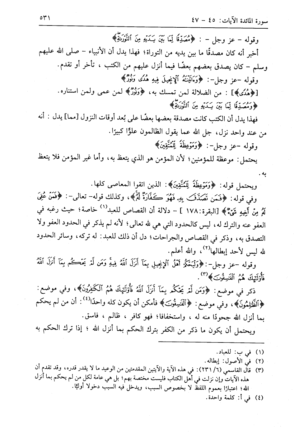 وقوله - عَزَّ وَجَلَّ -: (وَلْيَحْكُمْ أَهْلُ الْإِنْجِيلِ بِمَا أَنْزَلَ اللَّهُ فِيهِ وَمَنْ لَمْ يَحْكُمْ بِمَا أَنْزَلَ اللَّهُ فَأُولَئِكَ هُمُ الْفَاسِقُونَ (47)