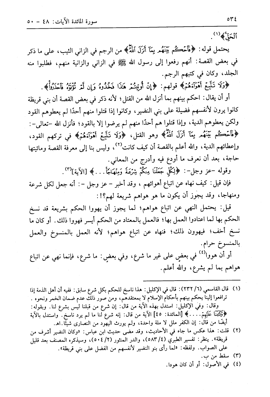 قيل: يحتمل النهي عن اتباع هواهم؛ لما يجوز أن يهووا الحكم بشريعة قد نسخ الحكم بها لما اعتادوا العمل بها؛ فالعمل بالمعتاد من الحكم أيسر فهووا ذلك. أو كان ما نسخ أخف؛ فيهوون ذلك؛ فنهاه عن اتباع هواهم؛ لأنه العمل بالمنسوخ والعمل بالمنسوخ حرام.
