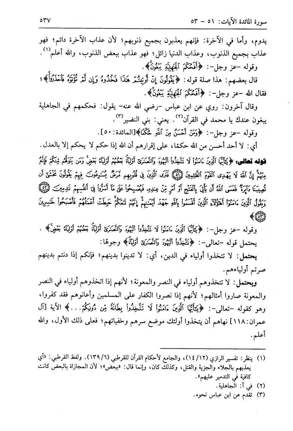 قوله تعالى: (يَا أَيُّهَا الَّذِينَ آمَنُوا لَا تَتَّخِذُوا الْيَهُودَ وَالنَّصَارَى أَوْلِيَاءَ بَعْضُهُمْ أَوْلِيَاءُ بَعْضٍ وَمَنْ يَتَوَلَّهُمْ مِنْكُمْ فَإِنَّهُ مِنْهُمْ إِنَّ اللَّهَ لَا يَهْدِي الْقَوْمَ الظَّالِمِينَ (51) فَتَرَى الَّذِينَ فِي قُلُوبِهِمْ مَرَضٌ يُسَارِعُونَ فِيهِمْ يَقُولُونَ نَخْشَى أَنْ تُصِيبَنَا دَائِرَةٌ فَعَسَى اللَّهُ أَنْ يَأْتِيَ بِالْفَتْحِ أَوْ أَمْرٍ مِنْ عِنْدِهِ فَيُصْبِحُوا عَلَى مَا أَسَرُّوا فِي أَنْفُسِهِمْ نَادِمِينَ (52) وَيَقُولُ الَّذِينَ آمَنُوا أَهَؤُلَاءِ الَّذِينَ أَقْسَمُوا بِاللَّهِ جَهْدَ أَيْمَانِهِمْ إِنَّهُمْ لَمَعَكُمْ حَبِطَتْ أَعْمَالُهُمْ فَأَصْبَحُوا خَاسِرِينَ (53)