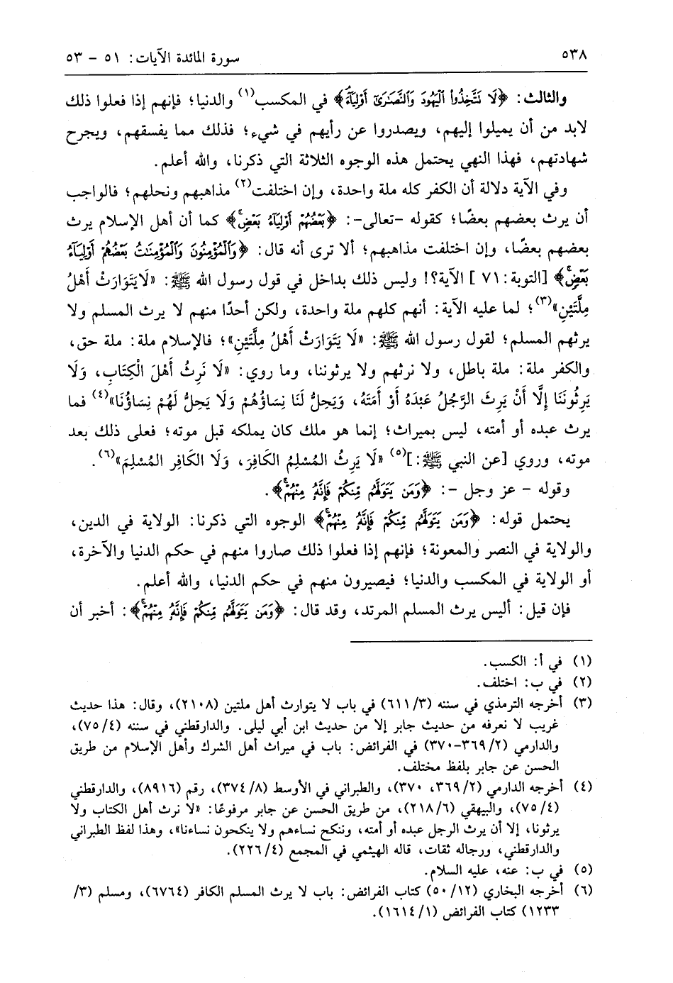 والثالث: (لَا تَتَّخِذُوا الْيَهُودَ وَالنَّصَارَى أَوْلِيَاءَ) في المكسب والدنيا؛ فإنهم إذا فعلوا ذلك لابد من أن يميلوا إليهم، ويصدروا عن رأيهم في شيء؛ فذلك مما يفسقهم، ويجرح شهادتهم، فهذا النهي يحتمل هذه الوجوه الثلاثة التي ذكرنا، واللَّه أعلم.