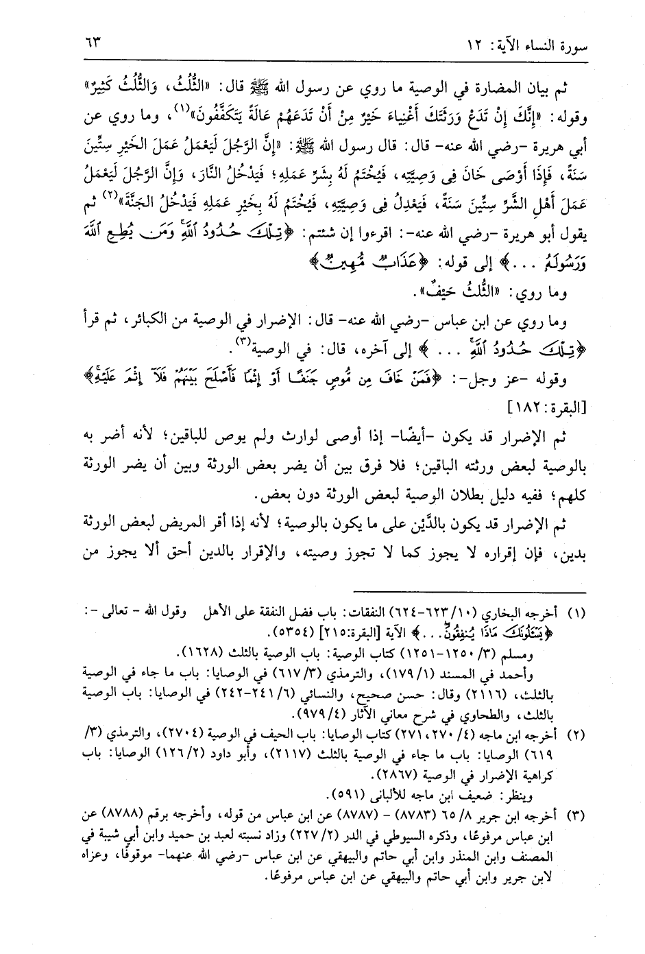 ثم بيان المضارة في الوصية ما روي عن رسول اللَّه - صَلَّى اللَّهُ عَلَيهِ وَسَلَّمَ - قال: " الثُّلُثُ، وَالثُّلُثُ كَثِيرٌ " وقوله: " إِنَّكَ إِنْ تَدَعْ وَرَثَتَكَ أَغْنِياءَ خَيرٌ مِنْ أَنْ تَدَعَهُم عَالَةً يَتَكَفَّفُونَ "، وما روي عن أبي هريرة - رَضِيَ اللَّهُ عَنْهُ - قال: قال رسول اللَّه - صَلَّى اللَّهُ عَلَيهِ وَسَلَّمَ -: " إِنَّ الرَّجُلَ لَيَعْمَلُ عَمَلَ الخَيرِ سِتِّينَ سَنَةً، فَإِذَا أَوْصَى خَانَ فِي وَصِيتِه، فَيُخْتَمُ لَهُ بِشَرِّ عَمَلِهِ؛ فَيَدْخُلُ النَّارَ، وإنَّ الرَّجُلَ لَيَعْمَلُ عَمَلَ أَهْلِ الشَرِّ سِتِّينَ سَنَةً، فَيَعْدِلُ فِي وَصِيّتهِ، فَيُخْتَمُ لَهُ بِخَيرِ عَمَلِهِ فَيَدْخُلُ الجَنَّةَ " ثم يقول أبو هريرة - رَضِيَ اللَّهُ عَنْهُ -: اقرءوا إن شئتم: (تِلْكَ حُدُودُ اللَّهِ وَمَنْ يُطِعِ اللَّهَ وَرَسُولَهُ. . .) إلى قوله: (عَذَابٌ مُهِينٌ)