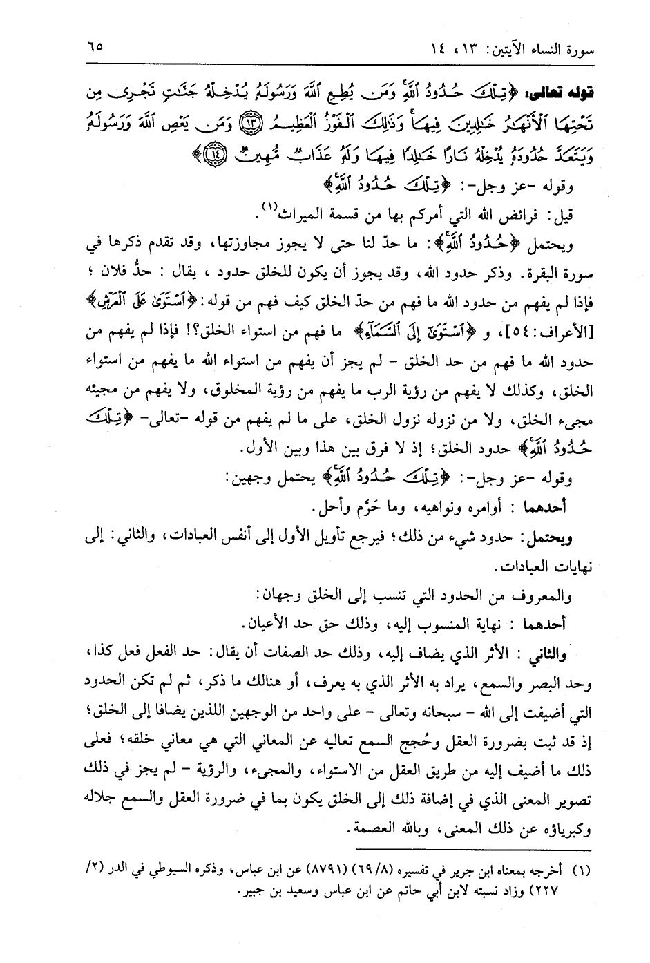 ويحتمل (تِلْكَ حُدُودُ اللَّهِ): ما حد لنا حتى لا يجوز مجاوزتها، وقد تقدم ذكرها في سُورَةِ البقرة. وذكر حدود اللَّه، وقد يجوز أن يكون للخلق حدود، يقال: حدُّ فلان؛ فإذا لم يفهم من حدود اللَّه ما فهم من حد الخلق كيف فهم من قوله: (اسْتَوَى عَلَى الْعَرْشِ)، و (استَوَى إلَى السَّمَاءِ) ما فهم من استواء الخلق؟! فإذا لم يفهم من حدود اللَّه ما فهم من حد الخلق - لم يجز أن يفهم من استواء اللَّه ما يفهم من استواء الخلق، وكذلك لا يفهم من رؤية الرب ما يفهم من رؤية المخلوق، ولا يفهم من مجيئه مجيء الخلق، ولا من نزوله نزول الخلق، على ما لم يفهم من قوله - تعالى - (تِلْكَ حُدُودُ اللَّهِ) حدود الخلق؛ إذ لا فرق بين هذا وبين الأول.