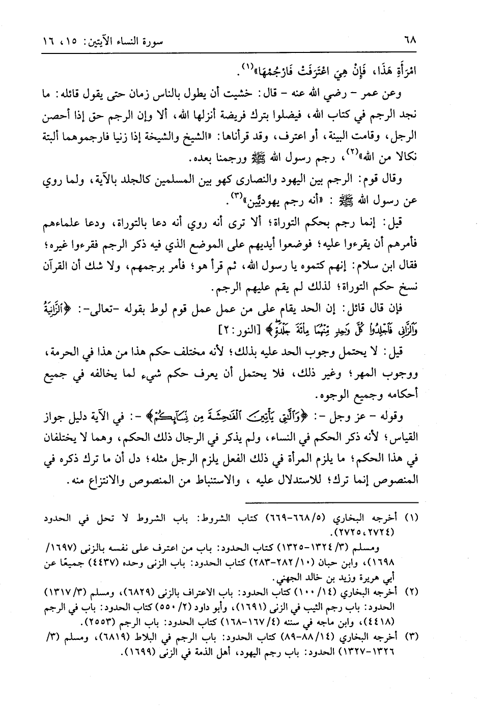 وعن عمر - رَضِيَ اللَّهُ عَنْهُ - قال: خشيت أن يطول بالناس زمان حتى يقول قائله: ما نجد الرجم في كتاب اللَّه، فيضلوا بترك فريضة أنزلها اللَّه، ألا وإن الرجم حق إذا أحصن الرجل، وقامت البينة، أو اعترف، وقد قرأناها: " الشيخ والشيخة إذا زنيا فارجموهما ألبتَّة نكالا من اللَّه "، رجم رسول اللَّه - صَلَّى اللَّهُ عَلَيهِ وَسَلَّمَ - ورجمنا بعده.