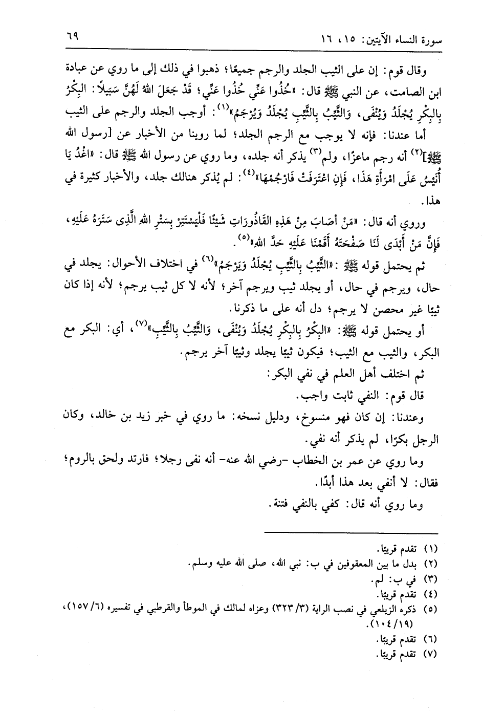 ثم يحتمل قوله - صَلَّى اللَّهُ عَلَيهِ وَسَلَّمَ -: " الثيبُ بِالثيبِ يُجْلَدُ ويرجَمُ " في اختلاف الأحوال: يجلد في حال، ويرجم في حال، أو يجلد ثيب ويرجم آخر؛ لأنه لا كل ثيب يرجم؛ لأنه إذا كان ثيبا غير محصن لا يرجم؛ دل أنه على ما ذكرنا.