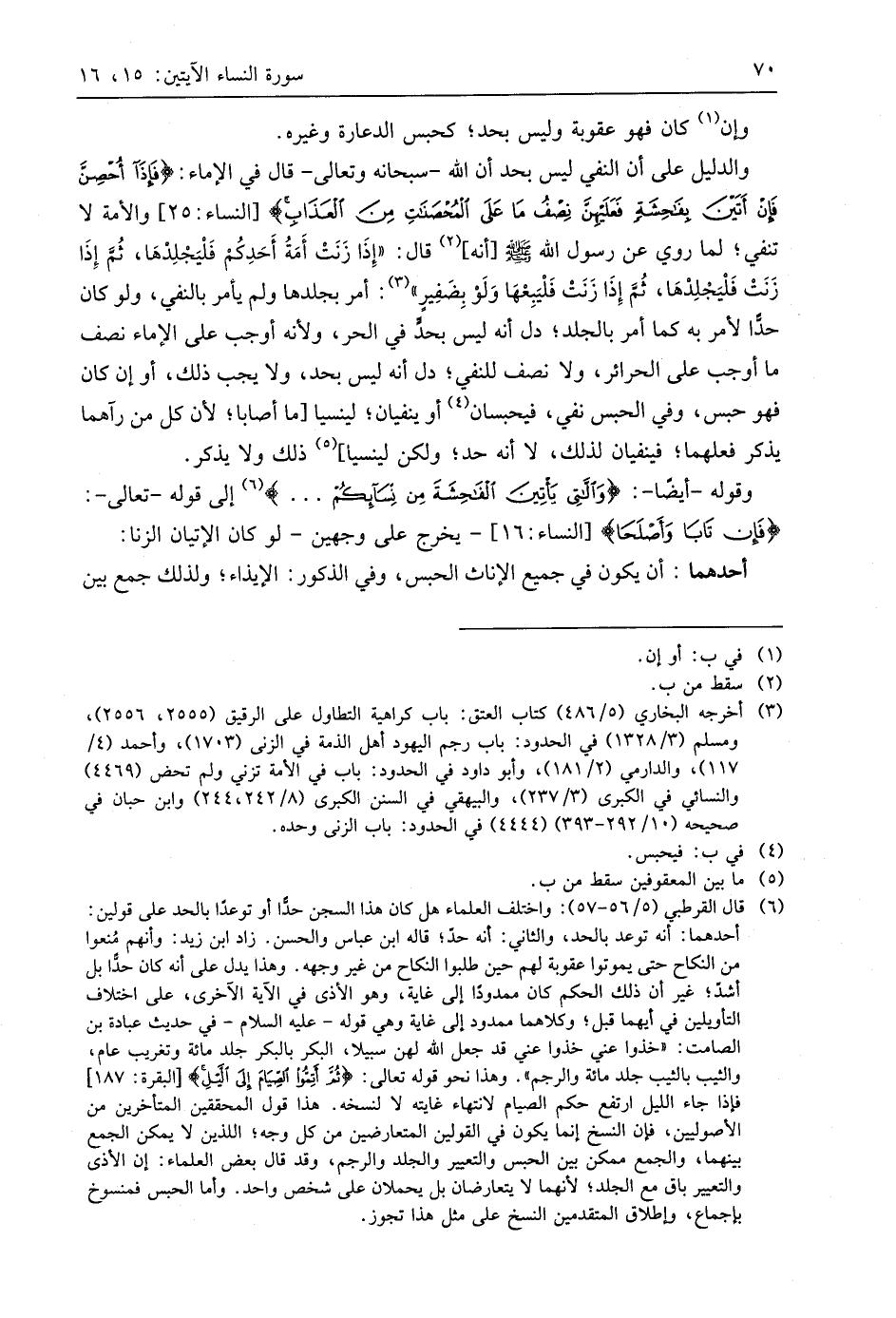 والدليل على أن النفي ليس بحد أن اللَّه - سبحانه وتعالى - قال في الإماء: (فَإِذَا أُحْصِنَّ فَإِنْ أَتَيْنَ بِفَاحِشَةٍ فَعَلَيْهِنَّ نِصْفُ مَا عَلَى الْمُحْصَنَاتِ مِنَ الْعَذَابِ)، والأمة لا تنفي؛ لما روي عن رسول اللَّه - صَلَّى اللَّهُ عَلَيهِ وَسَلَّمَ - أنه، قال: " إِذَا زَنَتْ أَمَةُ أَحَدِكُمْ فَلْيَجْلِدْهَا، ثُمَّ إِذَا زَنَتْ فَلْيَجلِدْهَا، ثُمَّ إِذَا زَنَتْ فَلْيَبِعْهَا وَلَوْ بِضَفِيرٍ ": أمر بجلدها ولم يأمر بالنفي، ولو كان حدا لأمر به كما أمر بالجلد؛ دل أنه ليس بحد في الحر، ولأنه أوجب على الإماء نصف ما أوجب على الحرائر، ولا نصف للنفي؛ دل أنه ليس بحد، ولا يجب ذلك، أو إن كان فهو حبس، وفي الحبس نفي، فيحبسان أو ينفيان؛ لينسيا ما أصابا؛ لأن كل من رآهما يذكر فعلهما؛ فينفيان لذلك، لا أنه حد؛ ولكن لينسبا ذلك ولا يذكر.