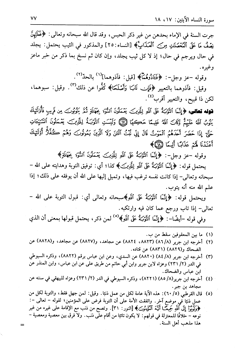 قوله تعالى: (إِنَّمَا التَّوْبَةُ عَلَى اللَّهِ لِلَّذِينَ يَعْمَلُونَ السُّوءَ بِجَهَالَةٍ ثُمَّ يَتُوبُونَ مِنْ قَرِيبٍ فَأُولَئِكَ يَتُوبُ اللَّهُ عَلَيْهِمْ وَكَانَ اللَّهُ عَلِيمًا حَكِيمًا (17) وَلَيْسَتِ التَّوْبَةُ لِلَّذِينَ يَعْمَلُونَ السَّيِّئَاتِ حَتَّى إِذَا حَضَرَ أَحَدَهُمُ الْمَوْتُ قَالَ إِنِّي تُبْتُ الْآنَ وَلَا الَّذِينَ يَمُوتُونَ وَهُمْ كُفَّارٌ أُولَئِكَ أَعْتَدْنَا لَهُمْ عَذَابًا أَلِيمًا (18)