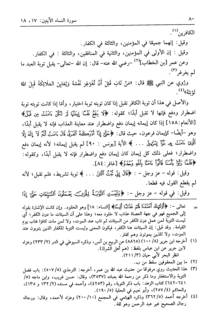 وقيل: في قوله - عَزَّ وَجَلَّ -: (وَلَيْسَتِ التَّوْبَةُ لِلَّذِينَ يَعْمَلُونَ السَّيِّئَاتِ حَتَّى إِذَا