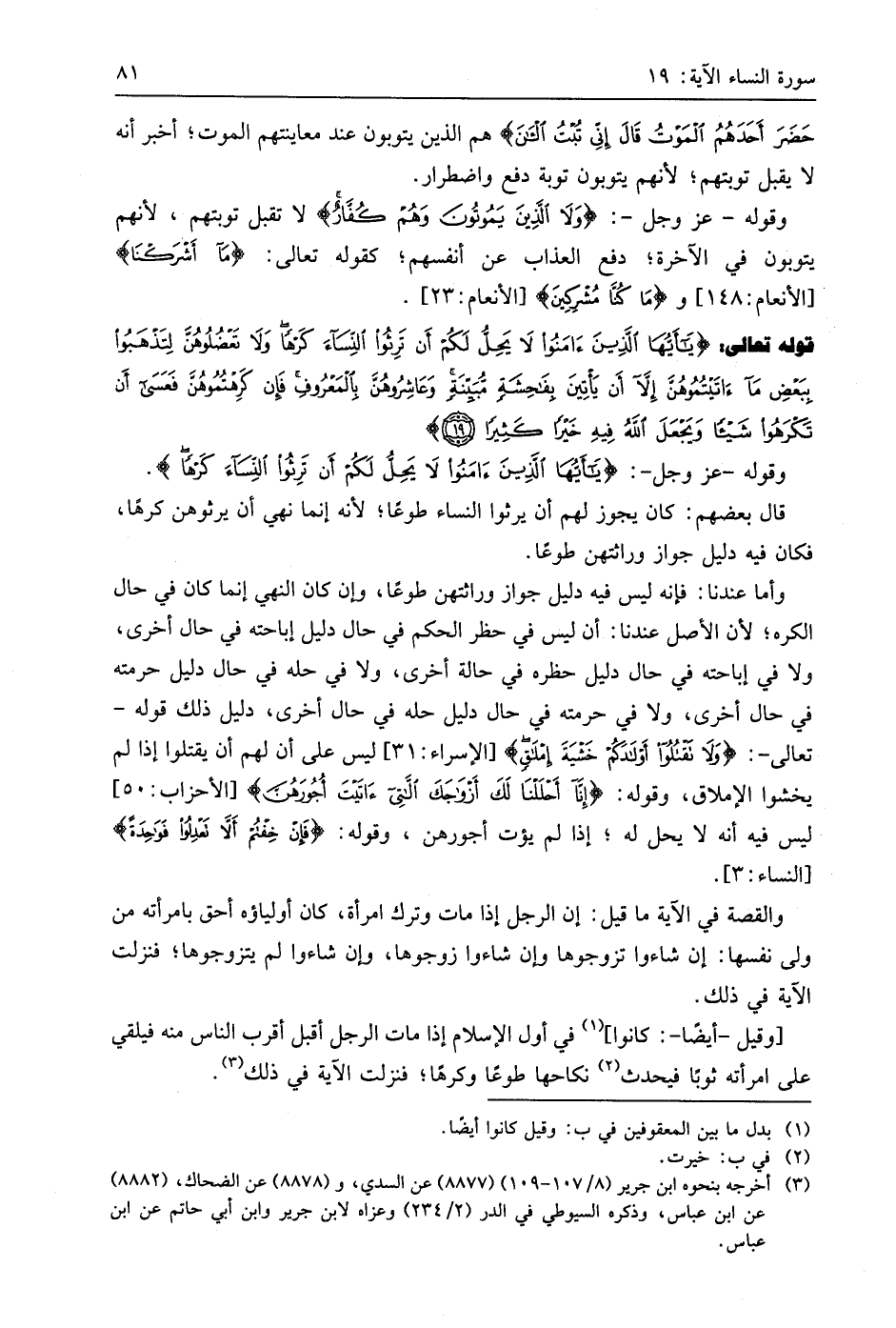 وقوله - عَزَّ وَجَلَّ -: (يَا أَيُّهَا الَّذِينَ آمَنُوا لَا يَحِلُّ لَكُمْ أَنْ تَرِثُوا النِّسَاءَ كَرْهًا).