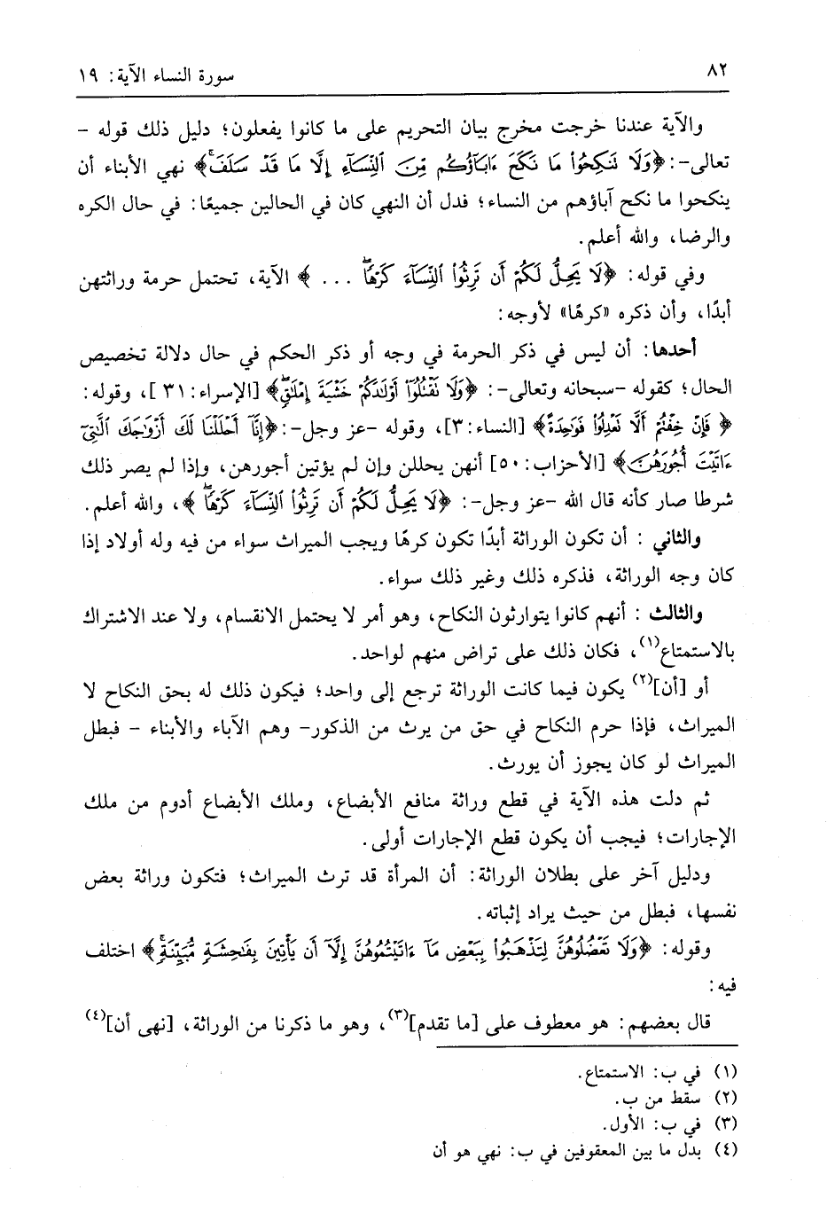 وفي قوله: (لَا يَحِلُّ لَكُمْ أَنْ تَرِثُوا النِّسَاءَ كَرْهًا. . .) الآية، تحتمل حرمة وراثتهن أبدًا، وأن ذكره " كرهًا " لأوجه: