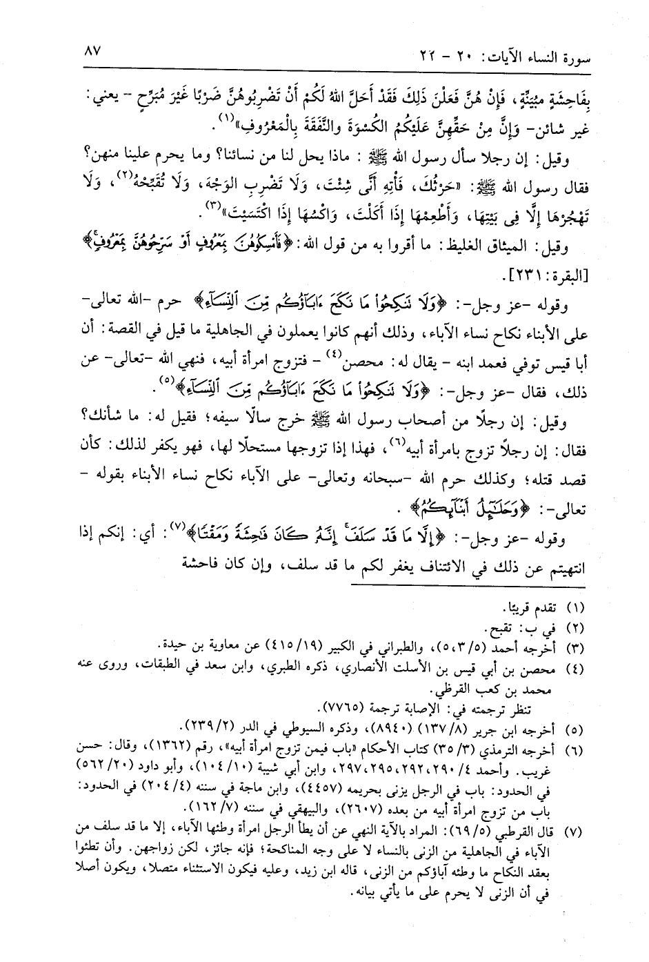 وقوله - عَزَّ وَجَلَّ -: (وَلَا تَنْكِحُوا مَا نَكَحَ آبَاؤُكُمْ مِنَ النِّسَاءِ إِلَّا مَا قَدْ سَلَفَ (22) حرم - اللَّه تعالى - على الأبناء نكاح نساء الآباء، وذلك أنهم كانوا يعملون في الجاهلية ما قيل في القصة: أن أبا قيس توفي فعمد ابنه - يقال له: محصن - فتزوج امرأة أبيه، فنهى اللَّه - تعالى - عن ذلك، فقال - عَزَّ وَجَلَّ -: (وَلَا تَنْكِحُوا مَا نَكَحَ آبَاؤُكُمْ مِنَ النِّسَاءِ).