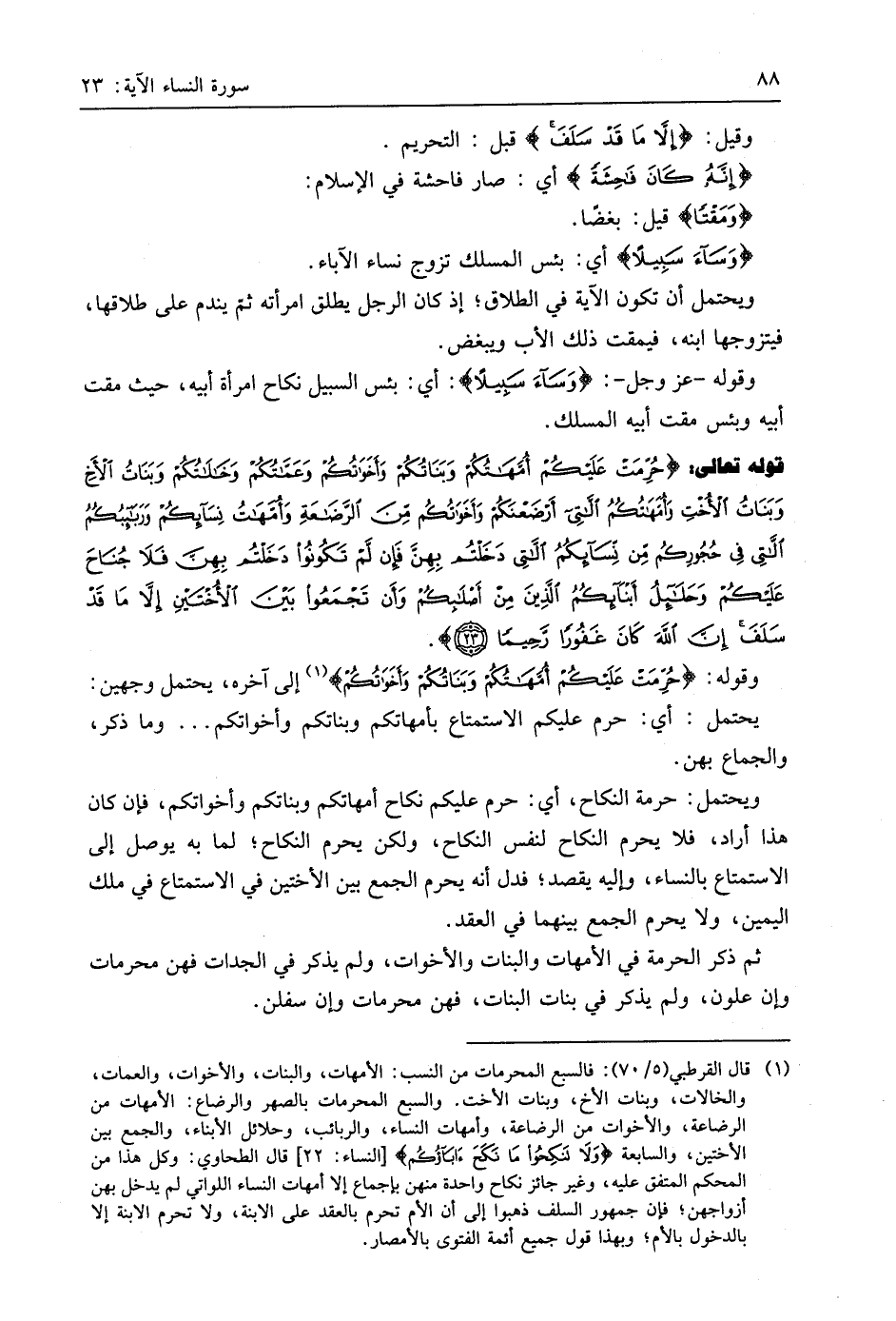 قوله تعالى: (حُرِّمَتْ عَلَيْكُمْ أُمَّهَاتُكُمْ وَبَنَاتُكُمْ وَأَخَوَاتُكُمْ وَعَمَّاتُكُمْ وَخَالَاتُكُمْ وَبَنَاتُ الْأَخِ وَبَنَاتُ الْأُخْتِ وَأُمَّهَاتُكُمُ اللَّاتِي أَرْضَعْنَكُمْ وَأَخَوَاتُكُمْ مِنَ الرَّضَاعَةِ وَأُمَّهَاتُ نِسَائِكُمْ وَرَبَائِبُكُمُ اللَّاتِي فِي حُجُورِكُمْ مِنْ نِسَائِكُمُ اللَّاتِي دَخَلْتُمْ بِهِنَّ فَإِنْ لَمْ تَكُونُوا دَخَلْتُمْ بِهِنَّ فَلَا جُنَاحَ عَلَيْكُمْ وَحَلَائِلُ أَبْنَائِكُمُ الَّذِينَ مِنْ أَصْلَابِكُمْ وَأَنْ تَجْمَعُوا بَيْنَ الْأُخْتَيْنِ إِلَّا مَا قَدْ سَلَفَ إِنَّ اللَّهَ كَانَ غَفُورًا رَحِيمًا (23)