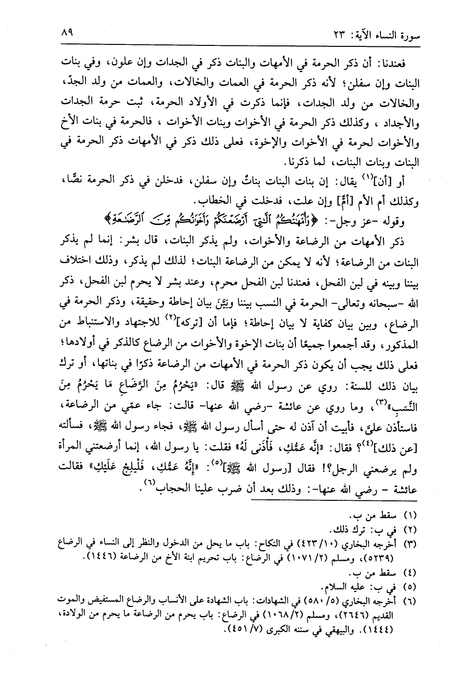 ذكر الأمهات من الرضاعة والأخوات، ولم يذكر البنات، قال بشر: إنما لم يذكر البنات من الرضاعة؛ لأنه لا يمكن من الرضاعة البنات؛ لذلك لم يذكر، وذلك اختلاف بيننا وبينه في لبن الفحل، فعندنا لبن الفحل محرم، وعند بشر لا يحرم لبن الفحل، ذكر اللَّه - سبحانه وتعالى - الحرمة في النسب بيننا وبَيّنَ بيان إحاطة وحقيقة، وذكر الحرمة في الرضاع، وبين بيان كفاية لا بيان إحاطة؛ فإما أن تركه للاجتهاد والاستنباط من المذكور، وقد أجمعوا جميعًا أن بنات الإخوة والأخوات من الرضاع كالذكر في أولادها؛ فعلى ذلك يجب أن يكون ذكر الحرمة في الأمهات من الرضاعة ذكرًا في بناتها، أو ترك بيان ذلك للسنة: روي عن رسول اللَّه - صَلَّى اللَّهُ عَلَيهِ وَسَلَّمَ - قال: " يَحْرُمُ مِنَ الرضَاعِ مَا يَحْرُمُ مِنَ النَّسَبِ "، وما روي عن عائشة - رضي اللَّه عنها - قالت: جاء عمِّي من الرضاعة، فاستأذن عليَّ، فأبيت أن آذن له حتى أسأل رسول اللَّه - صَلَّى اللَّهُ عَلَيهِ وَسَلَّمَ -، فجاء رسول اللَّه - صَلَّى اللَّهُ عَلَيهِ وَسَلَّمَ -، فسألته عن ذلك؟ فقال: " إنَه عَمُّكِ، فَأذَني لَهُ " فقلت: يا رسول اللَّه، إنما أرضعتني المرأة ولم يرضعني الرجل؟! فقال رسول اللَّه - صَلَّى اللَّهُ عَلَيهِ وَسَلَّمَ -: " إِنهُ عَمُّكِ، فَلْيلِجْ عَلَيكِ " فقالت عائشة - رضي اللَّه عنها -: وذلك بعد أن ضرب علينا الحجاب.