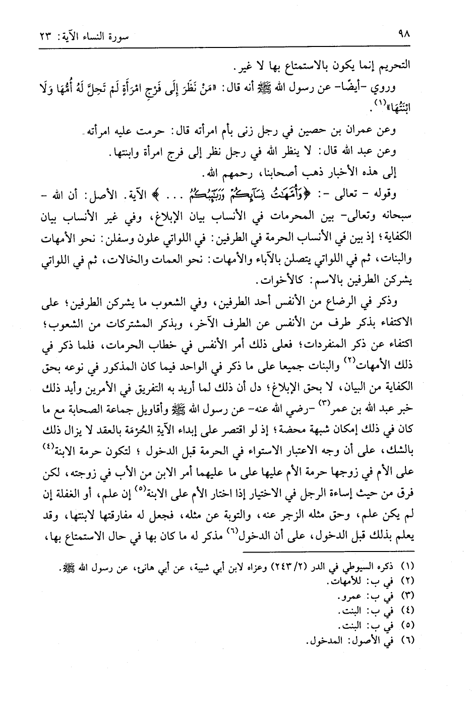 وقوله - تعالى -: (وَأُمَّهَاتُ نِسَائِكُمْ وَرَبَائِبُكُمُ. . .) الآية. الأصل: أن اللَّه - سبحانه وتعالى - بين المحرمات في الأنساب بيان الإبلاغ، وفي غير الأنساب بيان الكفاية؛ إذ بين في الأنساب الحرمة في الطرفين: في اللواتي علون وسفلن: نحو الأمهات والبنات، ثم في اللواتي يتصلن بالآباء والأمهات: نحو العمات والخالات، ثم في اللواتي يشركن الطرفين بالاسم: كالأخوات.