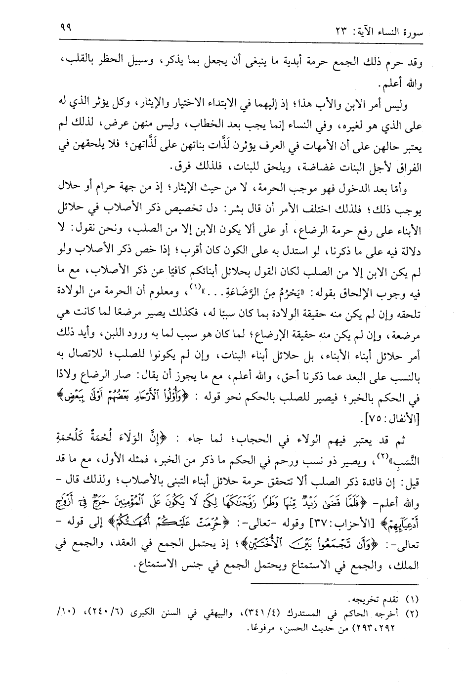 ثم قد يعتبر فيهم الولاء في الحجاب؛ لما جاء: " إِنَّ الوَلَاءَ لُحْمَةٌ كَلُحْمَةِ النَّسَبِ "، ويصير ذو نسب ورحم في الحكم ما ذكر من الخبر، فمثله الأول، مع ما قد قيل: إن فائدة ذكر الصلب ألا تتحقق حرمة حلائل أبناء التبني بالأصلاب؛ ولذلك قال - واللَّه أعلم - (فَلَمَّا قَضَى زَيْدٌ مِنْهَا وَطَرًا زَوَّجْنَاكَهَا لِكَيْ لَا يَكُونَ عَلَى الْمُؤْمِنِينَ حَرَجٌ فِي أَزْوَاجِ أَدْعِيَائِهِمْ)، وقوله - تعالى -: (حُرِّمَتْ عَلَيْكُمْ أُمَّهَاتُكُمْ) إلى قوله - تعالى -: (وَأَنْ تَجْمَعُوا بَيْنَ الْأُخْتَيْنِ)؛ إذ يحتمل الجمع في العقد، والجمع في الملك، والجمع في الاستمتاع ويحتمل الجمع في جنس الاستمتاع.