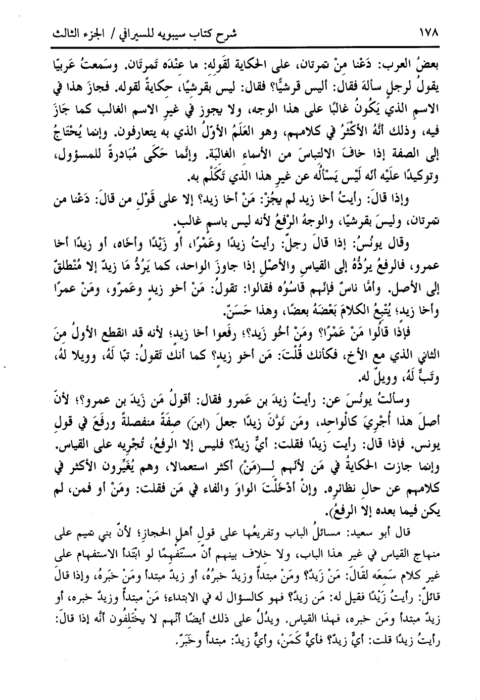 بعض العرب: دعنا من تمرتان، على الحكاية لقوله: ما عنده تمرتان. وسمعت عربيا يقول لرجل سأله فقال: أليس قرشيّا؟ فقال: ليس بقرشيا، حكاية لقوله. فجاز هذا في الاسم الذي يكون غالبا على هذا الوجه، ولا يجوز في غير الاسم الغالب كما جاز فيه، وذلك أنّه الأكثر في كلامهم، وهو العلم الأوّل الذي به يتعارفون. وإنما يحتاج إلى الصفة إذا خاف الالتباس من الأسماء الغالبة. وإنّما حكى مبادرة للمسؤول، وتوكيدا عليه أنّه ليس يسأله عن غير هذا الذي تكلّم به.
