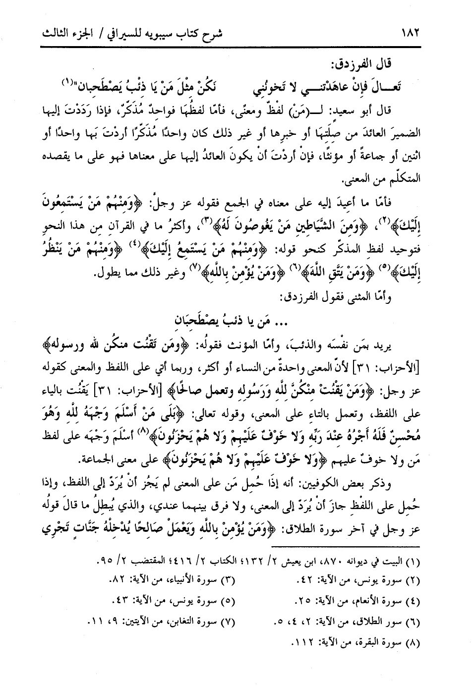 يريد بمن نفسه والذئب، وأمّا المؤنث فقوله: ومن تقنت منكن لله ورسوله [الأحزاب: 31] لأنّ المعنى واحدة من النساء أو أكثر، وربما أتي على اللفظ والمعنى كقوله عز وجل: وَمَنْ يَقْنُتْ مِنْكُنَّ لِلَّهِ وَرَسُولِهِ وَتَعْمَلْ صالِحاً [الأحزاب: 31] يقنت بالياء على اللفظ، وتعمل بالتاء على المعنى، وقوله تعالى: بَلى مَنْ أَسْلَمَ وَجْهَهُ لِلَّهِ وَهُوَ مُحْسِنٌ فَلَهُ أَجْرُهُ عِنْدَ رَبِّهِ وَلا خَوْفٌ عَلَيْهِمْ وَلا هُمْ يَحْزَنُونَ (¬8) أسلم وجهه على لفظ من ولا خوف عليهم وَلا خَوْفٌ عَلَيْهِمْ وَلا هُمْ يَحْزَنُونَ على معنى الجماعة.