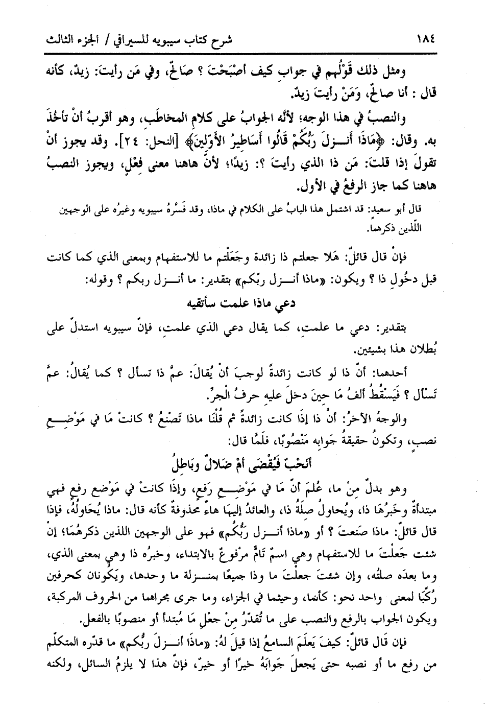 قال أبو سعيد: قد اشتمل هذا الباب على الكلام في ماذا، وقد فسّره سيبويه وغيره على الوجهين اللّذين ذكرهما.