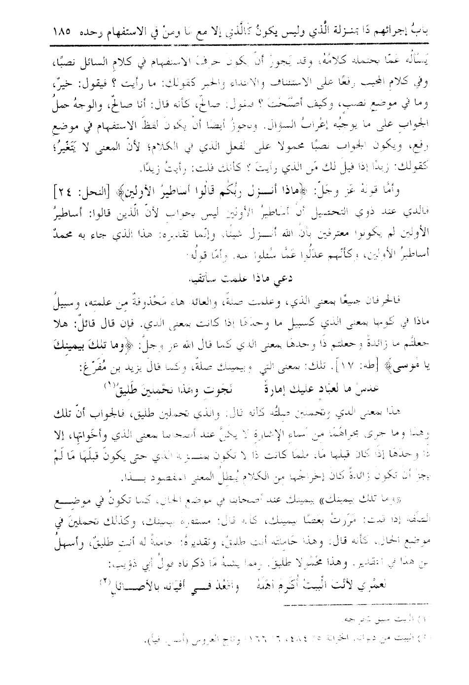 فالحرفان جميعا بمعنى الذي، وعلمت صلة، والعائد هاء محذوفة من علمته، وسبيل ماذا في كونها بمعنى الذي كسبيل ما وحدها إذا كانت بمعنى الذي. فإن قال قائل: هلا جعلتم ما زائدة وجعلتم ذا وحدها بمعنى الذي كما قال الله عز وجلّ: وَما تِلْكَ بِيَمِينِكَ يا مُوسى [طه: 17]. تلك: بمعنى التي وبيمينك صلة، وكما قال يزيد بن مفرّغ: