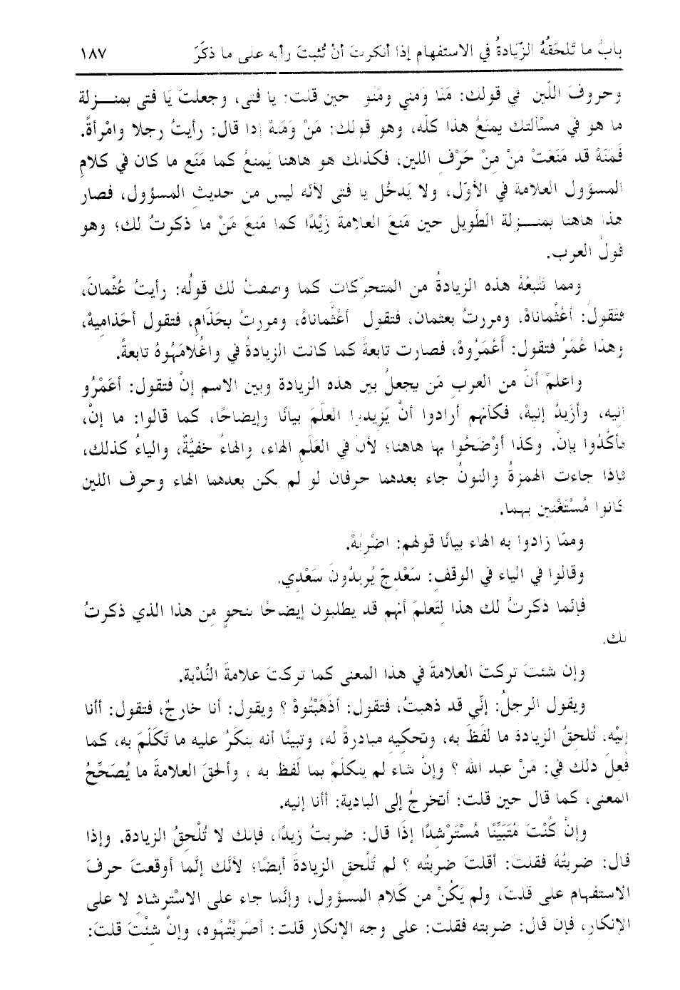 ويقول الرجل: إنّي قد ذهبت، فتقول: أذهبتوه؟ ويقول: أنا خارج، فتقول: أأنا إنيه، تلحق الزيادة ما لفظ به، وتحكيه مبادرة له، وتبينا أنه ينكر عليه ما تكلّم به، كما فعل ذلك في: من عبد الله؟ وإن شاء لم يتكلّم بما لفظ به، وألحق العلامة ما يصحّح المعنى، كما قال حين قلت: أتخرج إلى البادية: أأنا إنيه.