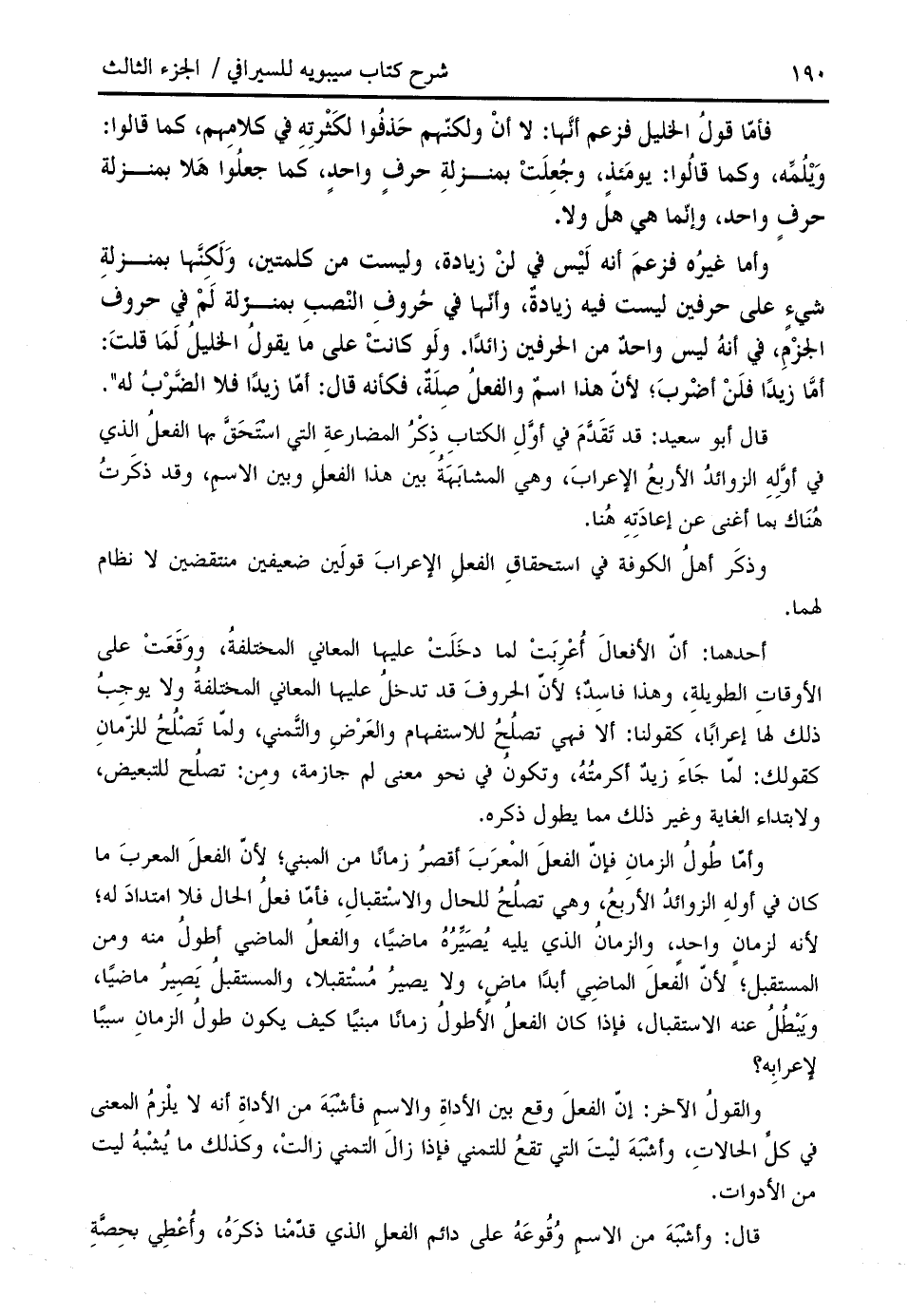 وأمّا طول الزمان فإنّ الفعل المعرب أقصر زمانا من المبني؛ لأنّ الفعل المعرب ما كان في أوله الزوائد الأربع، وهي تصلح للحال والاستقبال، فأمّا فعل الحال فلا امتداد له؛ لأنه لزمان واحد، والزمان الذي يليه يصيّره ماضيا، والفعل الماضي أطول منه ومن المستقبل؛ لأنّ الفعل الماضي أبدا ماض، ولا يصير مستقبلا، والمستقبل يصير ماضيا، ويبطل عنه الاستقبال، فإذا كان الفعل الأطول زمانا مبنيا كيف يكون طول الزمان سببا لإعرابه؟