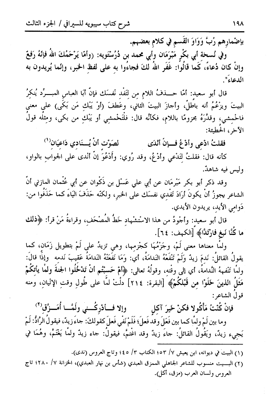 قال أبو سعيد: أمّا حذف اللام من لتفد نفسك فإنّ أبا العباس المبرّد ينكر البيت ويزعم أنه باطل، وأجاز البيت الثاني، وعطف (أو يبك من بكى) على معنى فاخمشي، وقدّره مجزوما باللام، فكأنّه قال: فلتخمشي أو يبك من بكى، ومثله قول الآخر، الحطيئة: