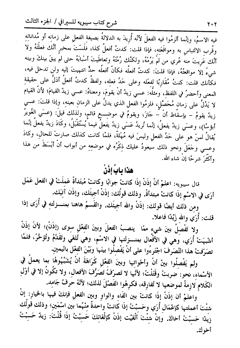 واعلم أن إذن إذا كانت بين الفاء والواو وبين الفعل فإنك فيها بالخيار: إن شئت أعملتها كإعمال أري وحسبت إذا كانت واحدة منهما بين اسمين؛ وذلك قولك زيدا حسبت أخاك. وإن شئت ألغيت إذن كإلغائك حسبت إذا قلت: زيد حسبت أخوك.