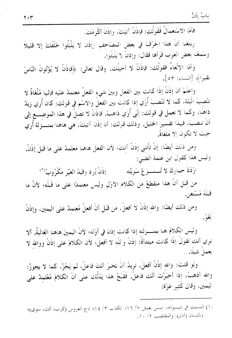 واعلم أنّ إذن إذا كانت بين الفعل وبين شيء الفعل معتمد عليه فإنّها ملغاة لا تنصب البتّة، كما لا تنصب أري إذا كانت بين الفعل والاسم في قولك: كان أري زيد ذاهبا، وكما لا تعمل في قولك: إنّي أري ذاهب. فإذن لا تصل في هذا الموضع إلى أن تنصب، فهذا تفسير الخليل. وذلك قولك: أنا إذن آتيك، هي هاهنا بمنزلة أري حيث لا تكون إلا ملغاة.