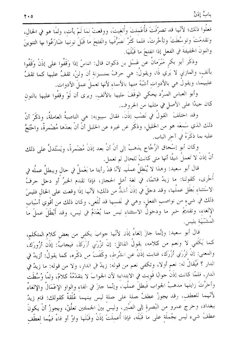 قال أبو سعيد: وهذا لا يبطل عملها لأنّا قد رأينا ما يعمل في حال ويبطل عمله في أخرى، كقولنا: ما زيد قائما، في لغة أهل الحجاز، فإذا تقدم الخبر أو دخل حرف الاستثناء بطل عملها، وقد دخل في إذن أشدّ من ذلك؛ لأنّها إذا وقعت على الحال فليس ذلك في شيء من نواصب الفعل، وهي في نفسها قد تلغى، وكان ذلك من أقوي أسباب الإلغاء، وتقديم خبر ما ودخول الاستثناء ليس مما يعدم في ليس، وقد أبطل عمل ما المشبّهة بليس.