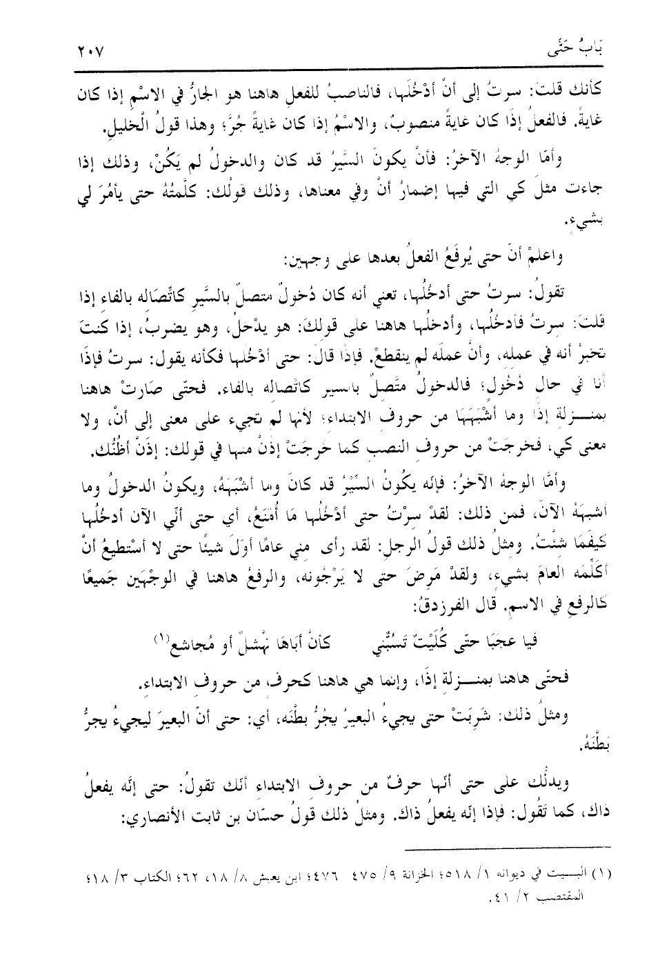 ويدلّك على حتى أنّها حرف من حروف الابتداء أنّك تقول: حتى إنّه يفعل ذاك، كما تقول: فإذا إنّه يفعل ذاك. ومثل ذلك قول حسّان بن ثابت الأنصاري: