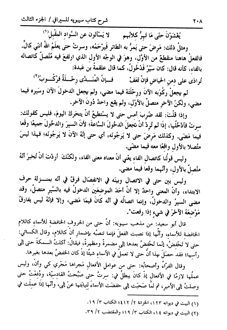 وليس بين حتى في الاتصال وبينه في الانفصال فرق في أنّه بمنزلة حرف الابتداء، وأنّ المعنى واحد إلا أنّ أحد الموضعين الدخول فيه بالسّير متصل، وقد مضى السير والدخول، وإنما اتصاله في أنّه كان فيما مضى، وإلا فإنّه ليس يفارق موضعه الآخر في شيء إذا رفعت ".