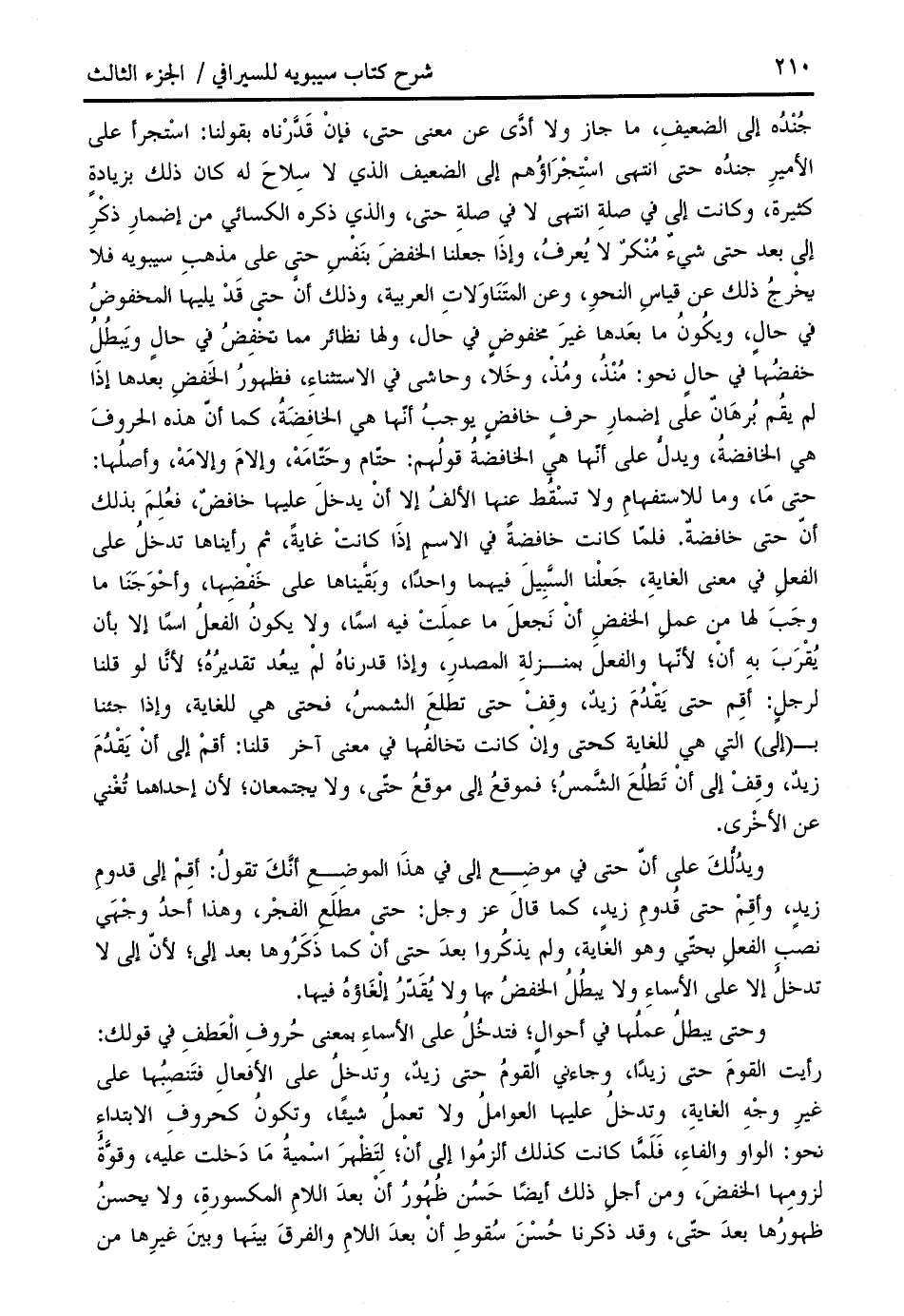رأيت القوم حتى زيدا، وجاءني القوم حتى زيد، وتدخل على الأفعال فتنصبها على غير وجه الغاية، وتدخل عليها العوامل ولا تعمل شيئا، وتكون كحروف الابتداء نحو: الواو والفاء، فلمّا كانت كذلك ألزموا إلى أن؛ لتظهر اسمية ما دخلت عليه، وقوّة لزومها الخفض، ومن أجل ذلك أيضا حسن ظهور أن بعد اللام المكسورة، ولا يحسن ظهورها بعد حتّى، وقد ذكرنا حسن سقوط أن بعد اللام والفرق بينها وبين غيرها من