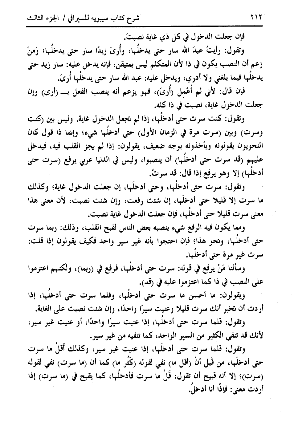 وتقول: كنت سرت حتى أدخلها، إذا لم تجعل الدخول غاية. وليس بين (كنت وسرت) وبين (سرت مرة في الزمان الأول) حتى أدخلها شيء؛ وإنما ذا قول كان النحويون يقولونه ويأخذونه بوجه ضعيف، يقولون: إذا لم يجز القلب فيه، فيدخل عليهم (قد سرت حتى أدخلها) أن ينصبوا، وليس في الدنيا عربي يرفع (سرت حتى أدخلها) إلا وهو يرفع إذا قال: قد سرت.