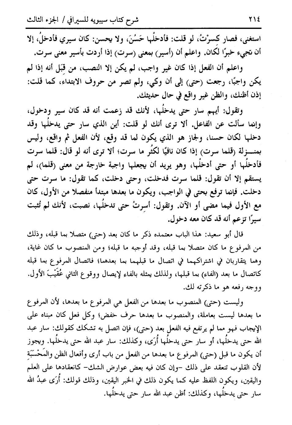 وليست (حتى) المنصوب ما بعدها من الفعل هي المرفوع ما بعدها، لأن المرفوع ما بعدها ليست بعاملة، والمنصوب ما بعدها حرف خفض؛ وكل فعل كان مبناه على الإيجاب فهو مما لم يرتفع فيه الفعل بعد (حتى)، فإن اتصل به تشكك كقولك: سار عبد الله حتى يدخلها، أو سار حتى يدخلها أرى، وكذلك: سار عبد الله حتى يدخلها. ويجوز أن يكون ما قبل (حتى) المرفوع ما بعدها من الفعل من باب أرى وأفعال الظن والمحسبة لأن القلوب تنعقد على ذلك- وإن كان فيه بعض عوارض الشك- كانعقادها على العلم واليقين، ويكون اللفظ عليه كما يكون ذلك في الخبر اليقين، وذلك قولك: أرى عبد الله سار حتى يدخلها، وكذلك: أظن عبد الله سار حتى يدخلها.