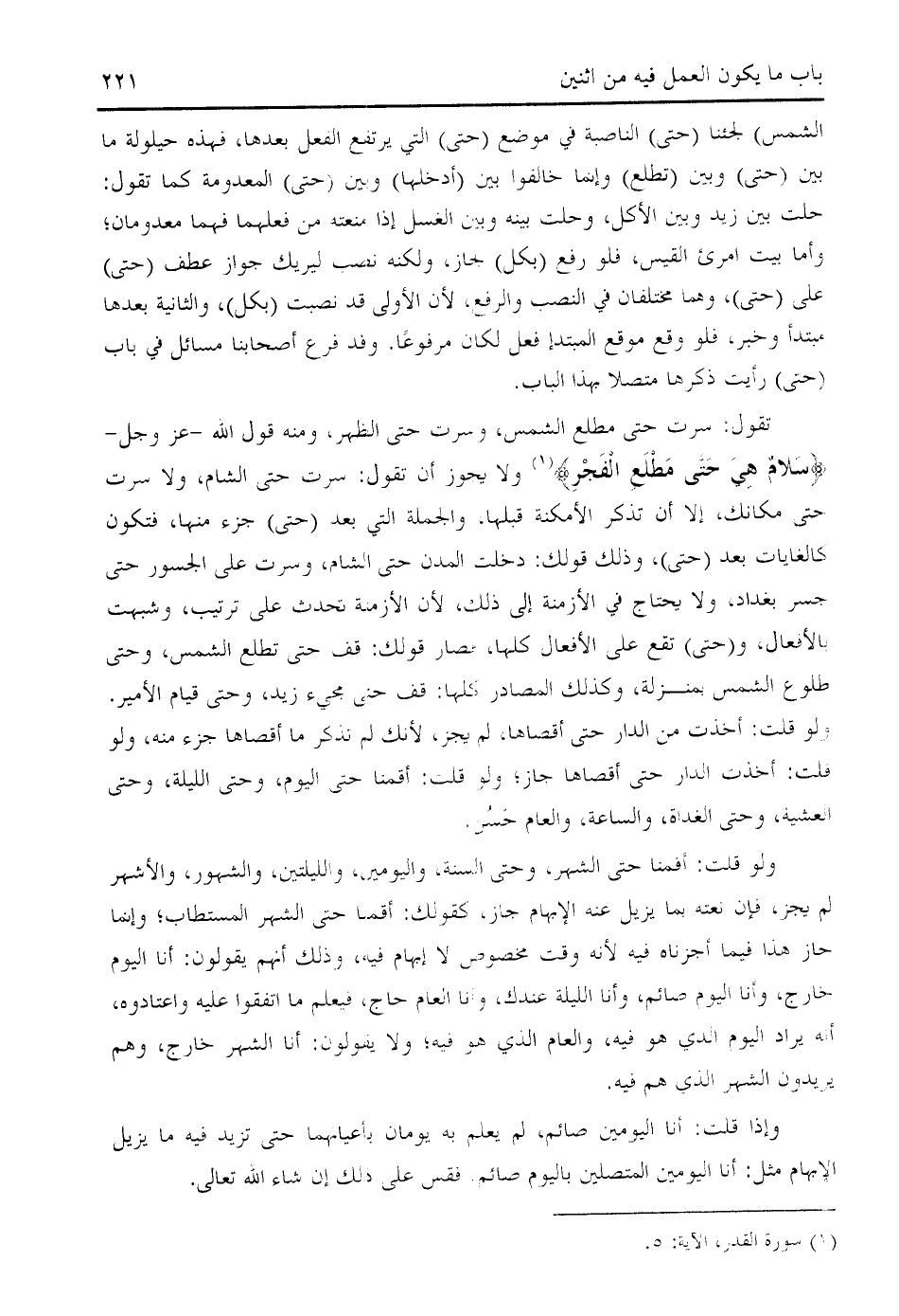 تقول: سرت حتى مطلع الشمس، وسرت حتى الظهر، ومنه قول الله- عز وجل- سَلامٌ هِيَ حَتَّى مَطْلَعِ الْفَجْرِ (¬1) ولا يجوز أن تقول: سرت حتى الشام، ولا سرت حتى مكانك، إلا أن تذكر الأمكنة قبلها، والجملة التي بعد (حتى) جزء منها، فتكون كالغايات بعد (حتى)، وذلك قولك: دخلت المدن حتى الشام، وسرت على الجسور حتى جسر بغداد، ولا يحتاج في الأزمنة إلى ذلك، لأن الأزمنة تحدث على ترتيب، وشبهت بالأفعال، و (حتى) تقع على الأفعال كلها، فصار قولك: قف حتى تطلع الشمس، وحتى طلوع الشمس بمنزلة، وكذلك المصادر كلها: قف حتى مجيء زيد، وحتى قيام الأمير.