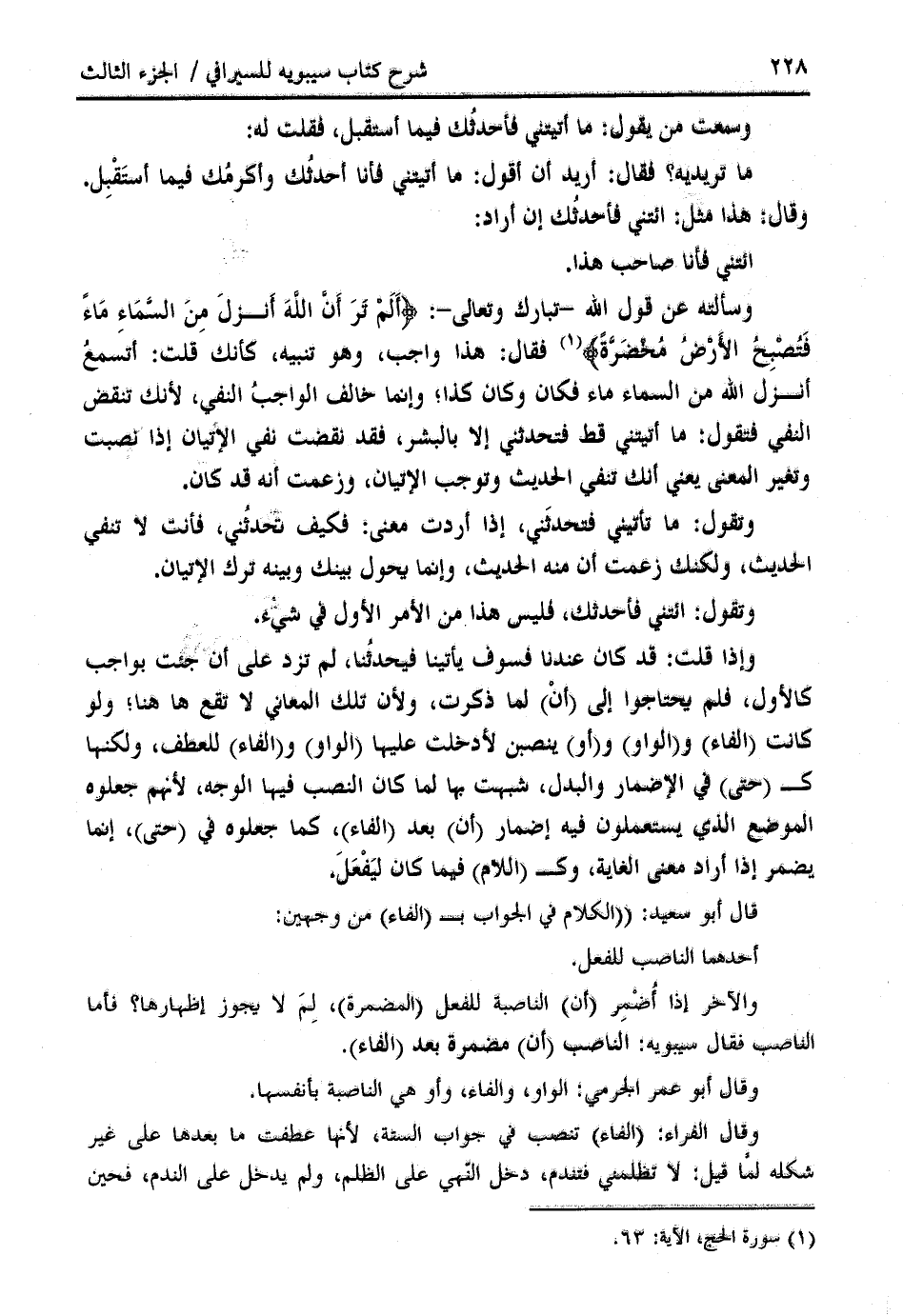 وسألته عن قول الله- تبارك وتعالى-: أَلَمْ تَرَ أَنَّ اللَّهَ أَنْزَلَ مِنَ السَّماءِ ماءً فَتُصْبِحُ الْأَرْضُ مُخْضَرَّةً (¬1) فقال: هذا واجب، وهو تنبيه، كأنك قلت: أتسمع أنزل الله من السماء ماء فكان وكان كذا؛ وإنما خالف الواجب النفي، لأنك تنقض النفي فتقول: ما أتيتني قط فتحدثني إلا بالبشر، فقد نقضت نفي الإتيان إذا نصبت وتغير المعنى يعني أنك تنفي الحديث وتوجب الإتيان، وزعمت أنه قد كان.