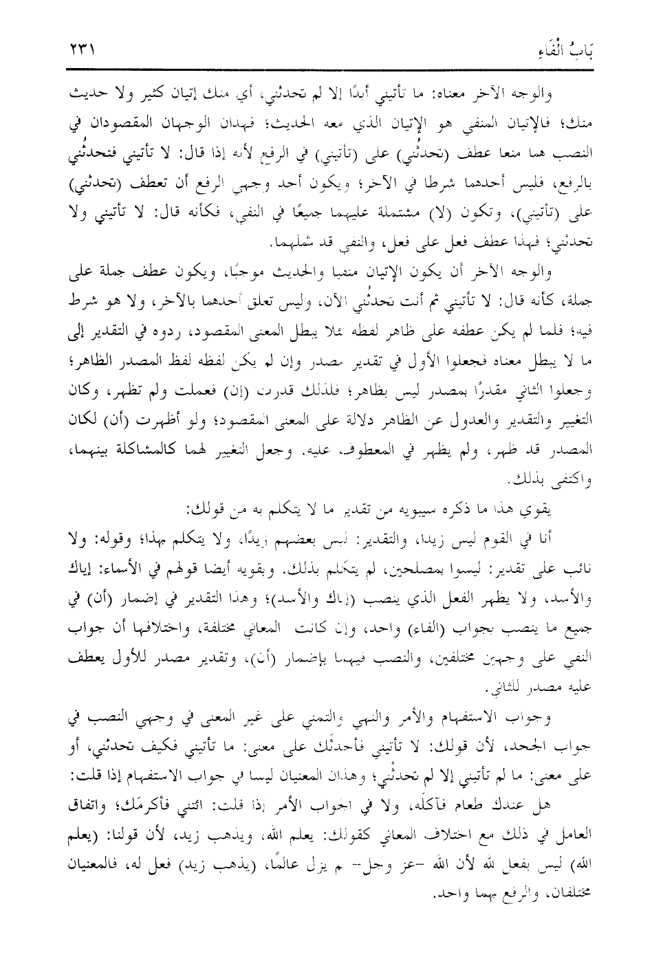 والوجه الآخر معناه: ما تأتيني أبدا إلا لم تحدثني، أي منك إتيان كثير ولا حديث منك؛ فالإتيان المنفي هو الإتيان الذي معه الحديث؛ فهذان الوجهان المقصودان في النصب هما منعا عطف (تحدثني) على (تأتيني) في الرفع لأنه إذا قال: لا تأتيني فتحدثني بالرفع، فليس أحدهما شرطا في الآخر؛ ويكون أحد وجهي الرفع أن تعطف (تحدثني) على (تأتيني)، وتكون (لا) مشتملة عليهما جميعا في النفي، فكأنه قال: لا تأتيني ولا تحدثني؛ فهذا عطف فعل على فعل، والنفي قد شملهما.