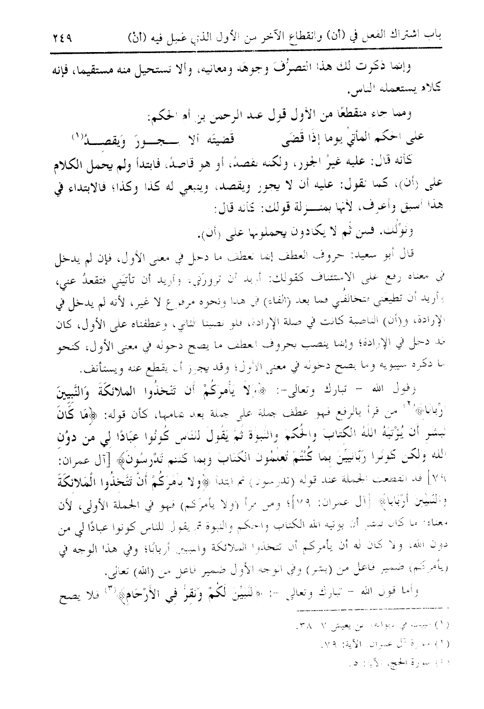 وقول الله- تبارك وتعالى-: وَلا يَأْمُرَكُمْ أَنْ تَتَّخِذُوا الْمَلائِكَةَ وَالنَّبِيِّينَ أَرْباباً (¬2) من قرأ بالرفع فهو عطف جملة على جملة بعد تمامها، كأن قوله: ما كانَ لِبَشَرٍ أَنْ يُؤْتِيَهُ اللَّهُ الْكِتابَ وَالْحُكْمَ وَالنُّبُوَّةَ ثُمَّ يَقُولَ لِلنَّاسِ كُونُوا عِباداً لِي مِنْ دُونِ اللَّهِ وَلكِنْ كُونُوا رَبَّانِيِّينَ بِما كُنْتُمْ تُعَلِّمُونَ الْكِتابَ وَبِما كُنْتُمْ تَدْرُسُونَ [آل عمران: