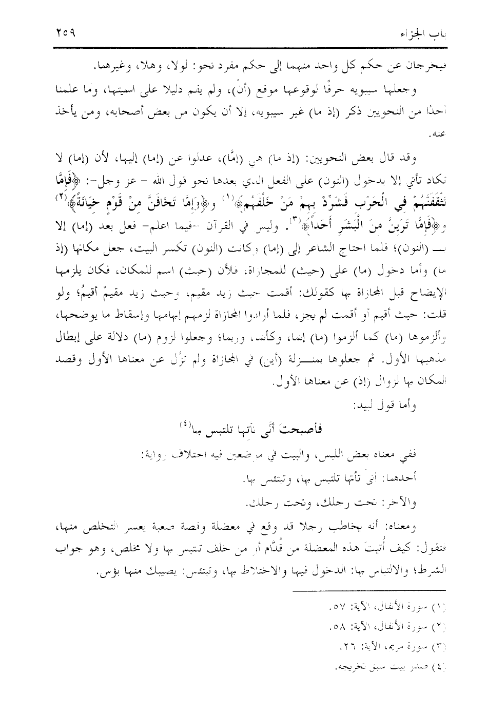 وجعلها سيبويه حرفا لوقوعها موقع (أن)، ولم يقم دليلا على اسميتها، وما علمنا أحدا من النحويين ذكر (إذ ما) غير سيبويه، إلا أن يكون من بعض أصحابه، ومن يأخذ عنه.