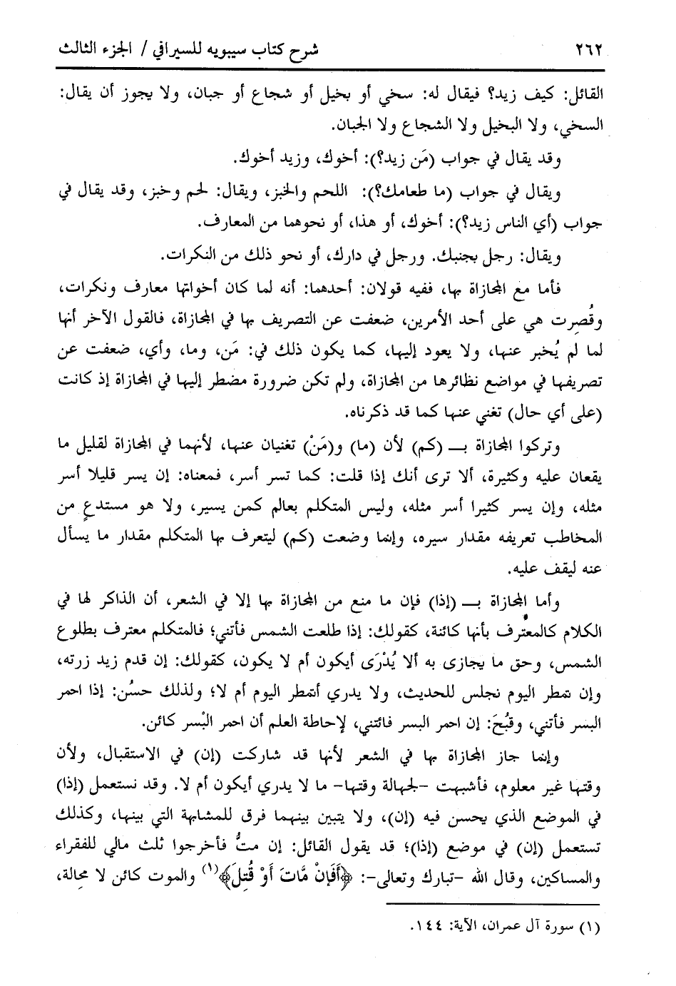 وتركوا المجازاة ب (كم) لأن (ما) و (من) تغنيان عنها، لأنهما في المجازاة لقليل ما يقعان عليه وكثيرة، ألا ترى أنك إذا قلت: كما تسر أسر، فمعناه: إن يسر قليلا أسر مثله، وإن يسر كثيرا أسر مثله، وليس المتكلم بعالم كمن يسير، ولا هو مستدع من المخاطب تعريفه مقدار سيره، وإنما وضعت (كم) ليتعرف بها المتكلم مقدار ما يسأل عنه ليقف عليه.