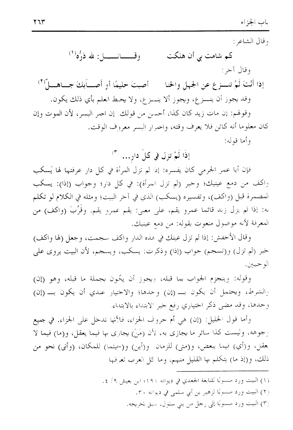 فإن أبا عمر الجرمي كان يفسره: إذا لم تزل المرأة في كل دار عرفتها لها يسكب واكف من دمع عينيك؛ وخبر (لم تزل المرأة): في كل دار؛ وجواب (إذا): يسكب المضمرة قبل (واكف)، وتفسيره (يسكب) الذي في آخر البيت؛ ومثله في الكلام لو تكلم به: إذا لم يزل زيد قائما عمرو يقم، على معنى: يقم عمرو يقم. وقرب (واكف) من المعرفة لأنه موصول منعوت بقوله: من دمع عينيك.