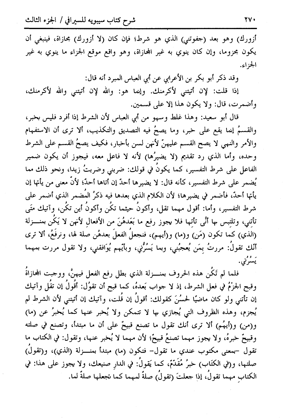 قال أبو سعيد: وهذا غلط وسهو من أبي العباس لأن الشرط إذا أفرد فليس بخبر، والقسم إنما يقع على خبر، وما يصح فيه التصديق والتكذيب، ألا ترى أن الاستفهام والأمر والنهي لا يصح القسم عليهنّ لأنهن لسن بأخبار، فكيف يصح القسم على الشرط وحده، وأما الذي رد تقديم (لا يضيرها) لأنه لا فاعل معه، فيجوز أن يكون ضمير الفاعل على شرط التفسير، كما يكون في قولك: ضربني وضربت زيدا، ونحو ذلك مما يضمر على شرط التفسير، كأنه قال: لا يضيرها أحد إن أتاها أحد؛ لأنّ معنى من يأتها إن يأتها أحد، فأضمر في يضيرها؛ لأن الكلام الذي بعدها فيه ذكر المضمر الذي أضمر على شرط التفسير، وأما: أقول مهما تقل، وأكون حيثما تكن وأكون أين تكن، وآتيك متى تأتني، وتلتبس بها أنّى تأتها فلا يجوز رفع ما بعدهن من الأفعال لأنهن لا يكن بمنزلة (الذي) كما تكون (من) و (ما) و (أيهم)، فنجعل الفعل بعدهن صلة لها، ونرفع، ألا ترى أنّك تقول: مررت بمن يعجبني، وبما يسرّني، وبأيّهم يوافقني، ولا تقول مررت بمهما يسرني.