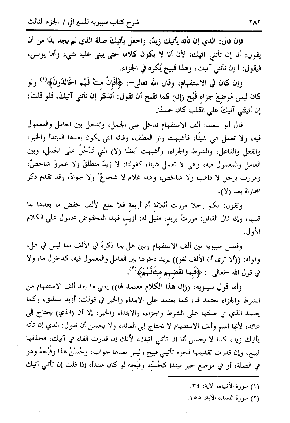 وأما قول سيبويه: ((إن هذا الكلام معتمد لها)) يعني ما بعد ألف الاستفهام من الشرط والجزاء معتمد لها، كما يعتمد على الابتداء والخبر في قولك: أزيد منطلق، وكما يعتمد الذي في صلتها على الشرط والجزاء، والابتداء والخبر، إلا أن (الذي) يحتاج إلى عائد، لأنها اسم وألف الاستفهام لا تحتاج إلى العائد، ولا يحسن أن تقول: الذي إن