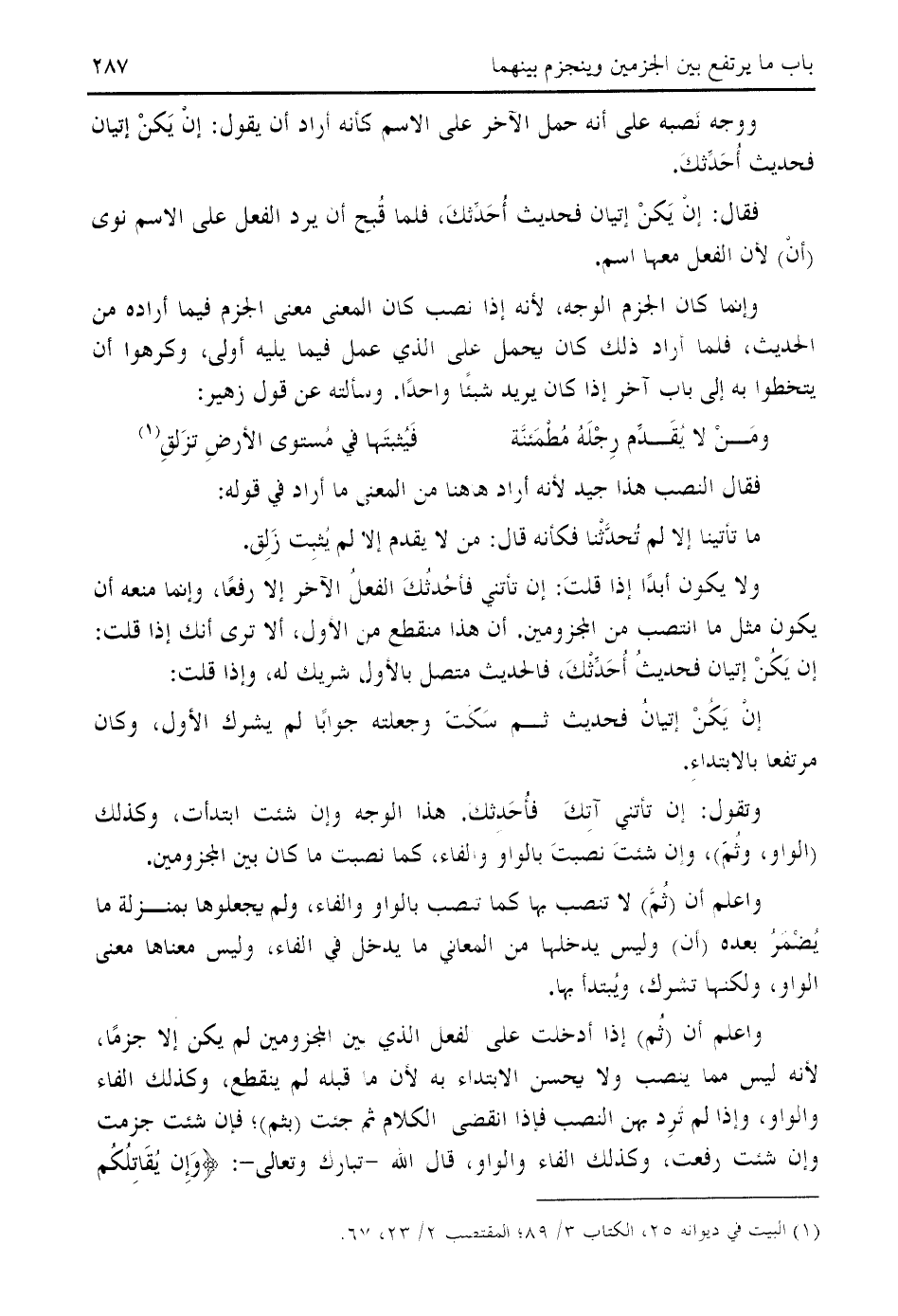 واعلم أن (ثم) إذا أدخلت على الفعل الذي بين المجزومين لم يكن إلا جزما، لأنه ليس مما ينصب ولا يحسن الابتداء به لأن ما قبله لم ينقطع، وكذلك الفاء والواو، وإذا لم ترد بهن النصب فإذا انقضى الكلام ثم جئت (بثم)؛ فإن شئت جزمت وإن شئت رفعت، وكذلك الفاء والواو، قال الله- تبارك وتعالى-: وَإِنْ يُقاتِلُوكُمْ